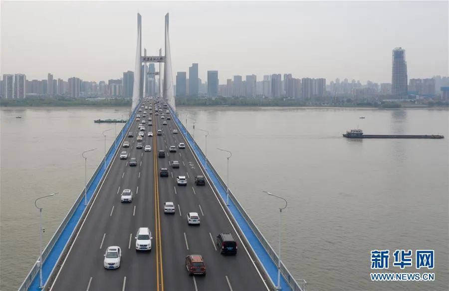 ▲武漢長(zhǎng)江二橋上的車(chē)流(4月16日攝,無(wú)人機(jī)照片)。新華社發(fā)(柯皓 攝)
