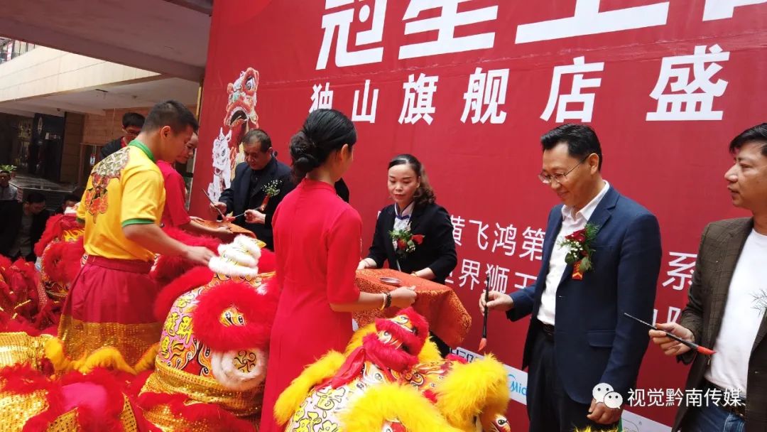 心悅建材、冠星王陶瓷獨(dú)山旗艦店總經(jīng)理?xiàng)钯或憺辄S飛鴻舞獅隊(duì)點(diǎn)睛