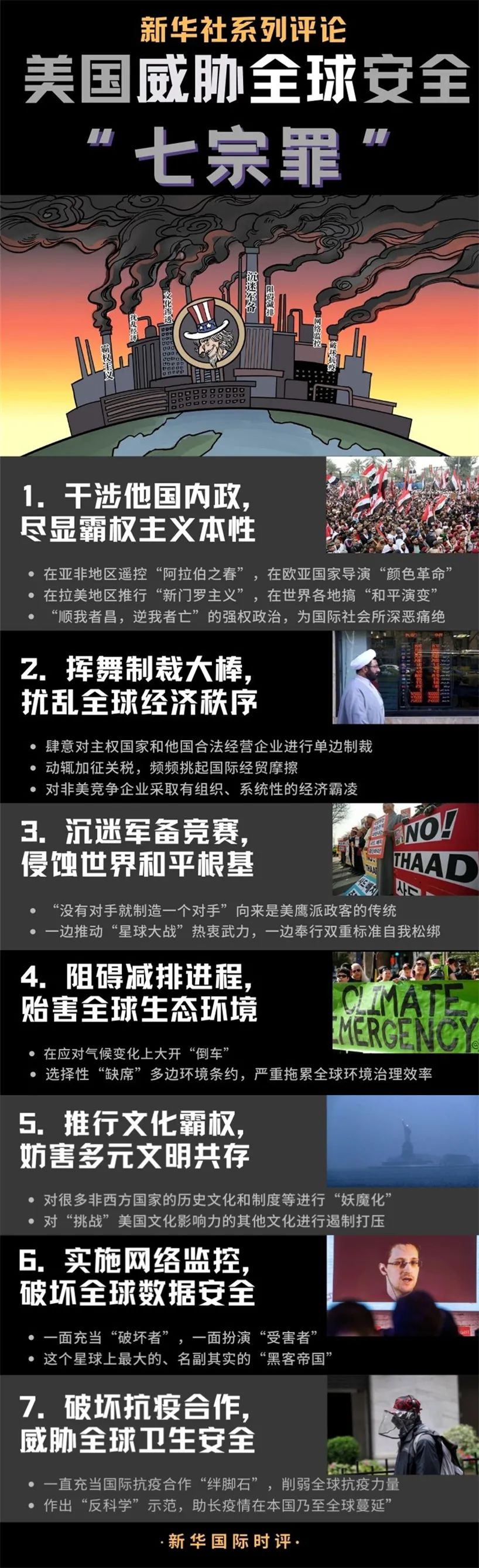多年來,美國利用自身經(jīng)濟、軍事優(yōu)勢大搞霸權(quán)主義,惡意劃分陣營,打壓異己。美國肆意干涉別國內(nèi)政,濫用單邊制裁,挑動軍備競賽,阻礙全球減排進程,推行文化輸出搞意識形態(tài)對立,實施網(wǎng)絡(luò)監(jiān)控,破壞抗疫合作,整個世界深受其害。