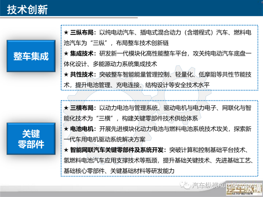 力爭經(jīng)過15年的持續(xù)努力,我國新能源汽車核心技術(shù)達(dá)到國際先進(jìn)水平,質(zhì)量品牌具備較強(qiáng)國際競爭力。純電動汽車成為新銷售車輛的主流,公共領(lǐng)域用車全面電動化,燃料電池汽車實(shí)現(xiàn)商業(yè)化應(yīng)用,高度自動駕駛汽車實(shí)現(xiàn)規(guī)模化應(yīng)用,充換電服務(wù)網(wǎng)絡(luò)便捷高效,氫燃料供給體系建設(shè)穩(wěn)步推進(jìn),有效促進(jìn)節(jié)能減排水平和社會運(yùn)行效率的提升。第三章 提高技術(shù)創(chuàng)新能力第一節(jié) 深化“三縱三橫”研發(fā)布局強(qiáng)化整車集成技術(shù)創(chuàng)新。以純電動汽車、插電式混合動力(含增程式)汽車、燃料電池汽車為“三縱”,布局整車技術(shù)創(chuàng)新鏈。研發(fā)新一代模塊化高性能整車平臺,攻關(guān)純電動汽車底盤一體化設(shè)計、多能源動力系統(tǒng)集成技術(shù),突破整車智能能量管理控制、輕量化、低摩阻等共性節(jié)能技術(shù),提升電池管理、充電連接、結(jié)構(gòu)設(shè)計等安全技術(shù)水平,提高新能源汽車整車綜合性能。提升產(chǎn)業(yè)基礎(chǔ)能力。以動力電池與管理系統(tǒng)、驅(qū)動電機(jī)與電力電子、網(wǎng)聯(lián)化與智能化技術(shù)為“三橫”,構(gòu)建關(guān)鍵零部件技術(shù)供給體系。開展先進(jìn)模塊化動力電池與燃料電池系統(tǒng)技術(shù)攻關(guān),探索新一代車用電機(jī)驅(qū)動系統(tǒng)解決方案,加強(qiáng)智能網(wǎng)聯(lián)汽車關(guān)鍵零部件及系統(tǒng)開發(fā),突破計算和控制基礎(chǔ)平臺技術(shù)、氫燃料電池汽車應(yīng)用支撐技術(shù)等瓶頸,提升基礎(chǔ)關(guān)鍵技術(shù)、先進(jìn)基礎(chǔ)工藝、基礎(chǔ)核心零部件、關(guān)鍵基礎(chǔ)材料等研發(fā)能力。