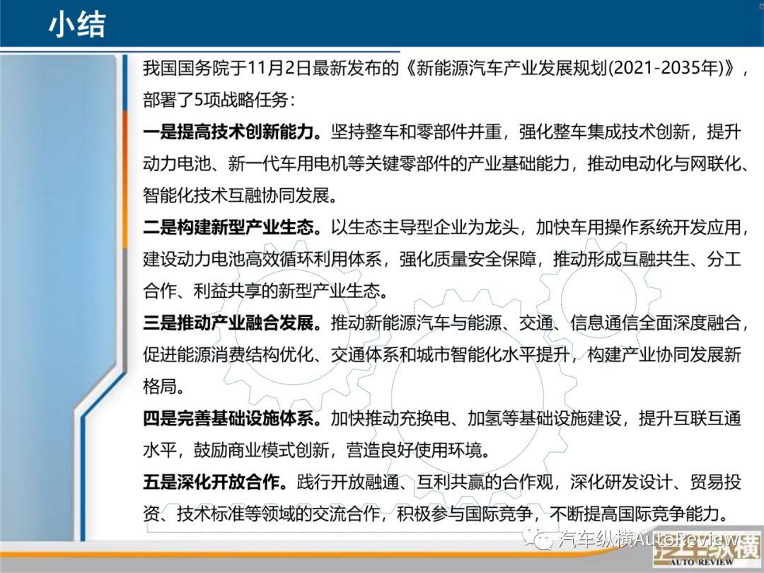 新能源汽車產(chǎn)業(yè)發(fā)展規(guī)劃(2021—2035年)發(fā)展新能源汽車是我國從汽車大國邁向汽車強(qiáng)國的必由之路,是應(yīng)對氣候變化、推動綠色發(fā)展的戰(zhàn)略舉措。2012年國務(wù)院發(fā)布《節(jié)能與新能源汽車產(chǎn)業(yè)發(fā)展規(guī)劃(2012—2020年)》以來,我國堅持純電驅(qū)動戰(zhàn)略取向,新能源汽車產(chǎn)業(yè)發(fā)展取得了巨大成就,成為世界汽車產(chǎn)業(yè)發(fā)展轉(zhuǎn)型的重要力量之一。與此同時,我國新能源汽車發(fā)展也面臨核心技術(shù)創(chuàng)新能力不強(qiáng)、質(zhì)量保障體系有待完善、基礎(chǔ)設(shè)施建設(shè)仍顯滯后、產(chǎn)業(yè)生態(tài)尚不健全、市場競爭日益加劇等問題。為推動新能源汽車產(chǎn)業(yè)高質(zhì)量發(fā)展,加快建設(shè)汽車強(qiáng)國,制定本規(guī)劃。第一節(jié) 新能源汽車為世界經(jīng)濟(jì)發(fā)展注入新動能當(dāng)前,全球新一輪科技革命和產(chǎn)業(yè)變革蓬勃發(fā)展,汽車與能源、交通、信息通信等領(lǐng)域有關(guān)技術(shù)加速融合,電動化、網(wǎng)聯(lián)化、智能化成為汽車產(chǎn)業(yè)的發(fā)展潮流和趨勢。新能源汽車融匯新能源、新材料和互聯(lián)網(wǎng)、大數(shù)據(jù)、人工智能等多種變革性技術(shù),推動汽車從單純交通工具向移動智能終端、儲能單元和數(shù)字空間轉(zhuǎn)變,帶動能源、交通、信息通信基礎(chǔ)設(shè)施改造升級,促進(jìn)能源消費(fèi)結(jié)構(gòu)優(yōu)化、交通體系和城市運(yùn)行智能化水平提升,對建設(shè)清潔美麗世界、構(gòu)建人類命運(yùn)共同體具有重要意義。近年來,世界主要汽車大國紛紛加強(qiáng)戰(zhàn)略謀劃、強(qiáng)化政策支持,跨國汽車企業(yè)加大研發(fā)投入、完善產(chǎn)業(yè)布局,新能源汽車已成為全球汽車產(chǎn)業(yè)轉(zhuǎn)型發(fā)展的主要方向和促進(jìn)世界經(jīng)濟(jì)持續(xù)增長的重要引擎。第二節(jié) 我國新能源汽車進(jìn)入加速發(fā)展新階段汽車產(chǎn)品形態(tài)、交通出行模式、能源消費(fèi)結(jié)構(gòu)和社會運(yùn)行方式正在發(fā)生深刻變革,為新能源汽車產(chǎn)業(yè)提供了前所未有的發(fā)展機(jī)遇。經(jīng)過多年持續(xù)努力,我國新能源汽車產(chǎn)業(yè)技術(shù)水平顯著提升、產(chǎn)業(yè)體系日趨完善、企業(yè)競爭力大幅增強(qiáng),2015年以來產(chǎn)銷量、保有量連續(xù)五年居世界首位,產(chǎn)業(yè)進(jìn)入疊加交匯、融合發(fā)展新階段。必須搶抓戰(zhàn)略機(jī)遇,鞏固良好勢頭,充分發(fā)揮基礎(chǔ)設(shè)施、信息通信等領(lǐng)域優(yōu)勢,不斷提升產(chǎn)業(yè)核心競爭力,推動新能源汽車產(chǎn)業(yè)高質(zhì)量可持續(xù)發(fā)展。第三節(jié) 融合開放成為新能源汽車發(fā)展的新特征隨著汽車動力來源、生產(chǎn)運(yùn)行方式、消費(fèi)使用模式全面變革,新能源汽車產(chǎn)業(yè)生態(tài)正由零部件、整車研發(fā)生產(chǎn)及營銷服務(wù)企業(yè)之間的“鏈?zhǔn)疥P(guān)系”,逐步演變成汽車、能源、交通、信息通信等多領(lǐng)域多主體參與的“網(wǎng)狀生態(tài)”。相互賦能、協(xié)同發(fā)展成為各類市場主體發(fā)展壯大的內(nèi)在需求,跨行業(yè)、跨領(lǐng)域融合創(chuàng)新和更加開放包容的國際合作成為新能源汽車產(chǎn)業(yè)發(fā)展的時代特征,極大地增強(qiáng)了產(chǎn)業(yè)發(fā)展動力,激發(fā)了市場活力,推動形成互融共生、合作共贏的產(chǎn)業(yè)發(fā)展新格局。以習(xí)近平新時代中國特色社會主義思想為指引,堅持創(chuàng)新、協(xié)調(diào)、綠色、開放、共享的發(fā)展理念,以深化供給側(cè)結(jié)構(gòu)性改革為主線,堅持電動化、網(wǎng)聯(lián)化、智能化發(fā)展方向,深入實(shí)施發(fā)展新能源汽車國家戰(zhàn)略,以融合創(chuàng)新為重點(diǎn),突破關(guān)鍵核心技術(shù),提升產(chǎn)業(yè)基礎(chǔ)能力,構(gòu)建新型產(chǎn)業(yè)生態(tài),完善基礎(chǔ)設(shè)施體系,優(yōu)化產(chǎn)業(yè)發(fā)展環(huán)境,推動我國新能源汽車產(chǎn)業(yè)高質(zhì)量可持續(xù)發(fā)展,加快建設(shè)汽車強(qiáng)國。市場主導(dǎo)。充分發(fā)揮市場在資源配置中的決定性作用,強(qiáng)化企業(yè)在技術(shù)路線選擇、生產(chǎn)服務(wù)體系建設(shè)等方面的主體地位;更好發(fā)揮政府在戰(zhàn)略規(guī)劃引導(dǎo)、標(biāo)準(zhǔn)法規(guī)制定、質(zhì)量安全監(jiān)管、市場秩序維護(hù)、綠色消費(fèi)引導(dǎo)等方面作用,為產(chǎn)業(yè)發(fā)展?fàn)I造良好環(huán)境。創(chuàng)新驅(qū)動。深入實(shí)施創(chuàng)新驅(qū)動發(fā)展戰(zhàn)略,建立以企業(yè)為主體、市場為導(dǎo)向、產(chǎn)學(xué)研用協(xié)同的技術(shù)創(chuàng)新體系,完善激勵和保護(hù)創(chuàng)新的制度環(huán)境,鼓勵多種技術(shù)路線并行發(fā)展,支持各類主體合力攻克關(guān)鍵核心技術(shù)、加大商業(yè)模式創(chuàng)新力度,形成新型產(chǎn)業(yè)創(chuàng)新生態(tài)。協(xié)調(diào)推進(jìn)。完善橫向協(xié)同、縱向貫通的協(xié)調(diào)推進(jìn)機(jī)制,促進(jìn)新能源汽車與能源、交通、信息通信深度融合,統(tǒng)籌推進(jìn)技術(sh