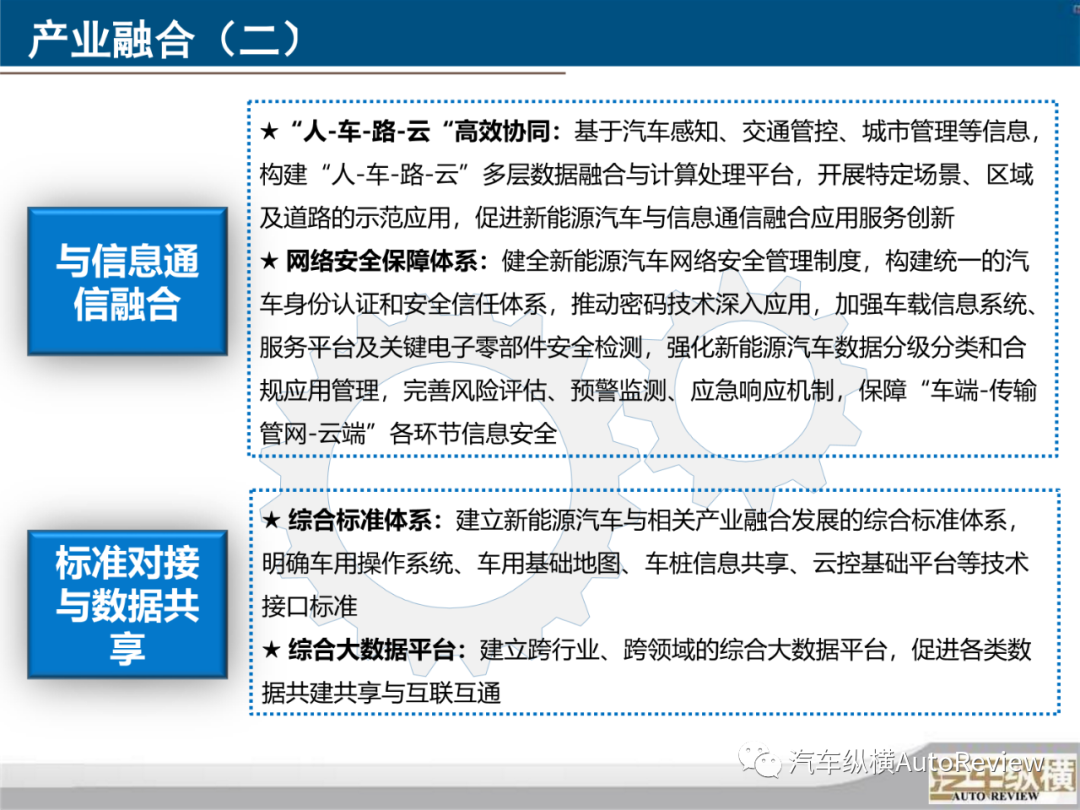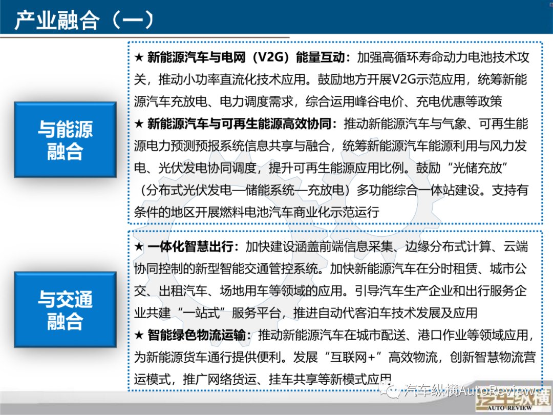 推進(jìn)智能化技術(shù)在新能源汽車研發(fā)設(shè)計、生產(chǎn)制造、倉儲物流、經(jīng)營管理、售后服務(wù)等關(guān)鍵環(huán)節(jié)的深度應(yīng)用。加快新能源汽車智能制造仿真、管理、控制等核心工業(yè)軟件開發(fā)和集成,開展智能工廠、數(shù)字化車間應(yīng)用示范。加快產(chǎn)品全生命周期協(xié)同管理系統(tǒng)推廣應(yīng)用,支持設(shè)計、制造、服務(wù)一體化示范平臺建設(shè),提升新能源汽車全產(chǎn)業(yè)鏈智能化水平。第四節(jié) 強(qiáng)化質(zhì)量安全保障推進(jìn)質(zhì)量品牌建設(shè)。開展新能源汽車產(chǎn)品質(zhì)量提升行動,引導(dǎo)企業(yè)加強(qiáng)設(shè)計、制造、測試驗(yàn)證等全過程可靠性技術(shù)開發(fā)應(yīng)用,充分利用互聯(lián)網(wǎng)、大數(shù)據(jù)、區(qū)塊鏈等先進(jìn)技術(shù),健全產(chǎn)品全生命周期質(zhì)量控制和追溯機(jī)制。引導(dǎo)企業(yè)強(qiáng)化品牌發(fā)展戰(zhàn)略,以提升質(zhì)量和服務(wù)水平為重點(diǎn)加強(qiáng)品牌建設(shè)。健全安全保障體系。落實(shí)企業(yè)負(fù)責(zé)、政府監(jiān)管、行業(yè)自律、社會監(jiān)督相結(jié)合的安全生產(chǎn)機(jī)制。強(qiáng)化企業(yè)對產(chǎn)品安全的主體責(zé)任,落實(shí)生產(chǎn)者責(zé)任延伸制度,加強(qiáng)對整車及動力電池、電控等關(guān)鍵系統(tǒng)的質(zhì)量安全管理、安全狀態(tài)監(jiān)測和維修保養(yǎng)檢測。健全新能源汽車整車、零部件以及維修保養(yǎng)檢測、充換電等安全標(biāo)準(zhǔn)和法規(guī)制度,加強(qiáng)安全生產(chǎn)監(jiān)督管理和新能源汽車安全召回管理。鼓勵行業(yè)組織加強(qiáng)技術(shù)交流,梳理總結(jié)經(jīng)驗(yàn),指導(dǎo)企業(yè)不斷提升安全水平。第五章 推動產(chǎn)業(yè)融合發(fā)展第一節(jié) 推動新能源汽車與能源融合發(fā)展加強(qiáng)新能源汽車與電網(wǎng)(V2G)能量互動。加強(qiáng)高循環(huán)壽命動力電池技術(shù)攻關(guān),推動小功率直流化技術(shù)應(yīng)用。鼓勵地方開展V2G示范應(yīng)用,統(tǒng)籌新能源汽車充放電、電力調(diào)度需求,綜合運(yùn)用峰谷電價、新能源汽車充電優(yōu)惠等政策,實(shí)現(xiàn)新能源汽車與電網(wǎng)能量高效互動,降低新能源汽車用電成本,提高電網(wǎng)調(diào)峰調(diào)頻、安全應(yīng)急等響應(yīng)能力。促進(jìn)新能源汽車與可再生能源高效協(xié)同。推動新能源汽車與氣象、可再生能源電力預(yù)測預(yù)報系統(tǒng)信息共享與融合,統(tǒng)籌新能源汽車能源利用與風(fēng)力發(fā)電、光伏發(fā)電協(xié)同調(diào)度,提升可再生能源應(yīng)用比例。鼓勵“光儲充放”(分布式光伏發(fā)電—儲能系統(tǒng)—充放電)多功能綜合一體站建設(shè)。支持有條件的地區(qū)開展燃料電池汽車商業(yè)化示范運(yùn)行。第二節(jié) 推動新能源汽車與交通融合發(fā)展發(fā)展一體化智慧出行服務(wù)。加快建設(shè)涵蓋前端信息采集、邊緣分布式計算、云端協(xié)同控制的新型智能交通管控系統(tǒng)。加快新能源汽車在分時租賃、城市公交、出租汽車、場地用車等領(lǐng)域的應(yīng)用,優(yōu)化公共服務(wù)領(lǐng)域新能源汽車使用環(huán)境。引導(dǎo)汽車生產(chǎn)企業(yè)和出行服務(wù)企業(yè)共建“一站式”服務(wù)平臺,推進(jìn)自動代客泊車技術(shù)發(fā)展及應(yīng)用。構(gòu)建智能綠色物流運(yùn)輸體系。推動新能源汽車在城市配送、港口作業(yè)等領(lǐng)域應(yīng)用,為新能源貨車通行提供便利。發(fā)展“互聯(lián)網(wǎng)+”高效物流,創(chuàng)新智慧物流營運(yùn)模式,推廣網(wǎng)絡(luò)貨運(yùn)、掛車共享等新模式應(yīng)用,打造安全高效的物流運(yùn)輸服務(wù)新業(yè)態(tài)。第三節(jié) 推動新能源汽車與信息通信融合發(fā)展推進(jìn)以數(shù)據(jù)為紐帶的“人—車—路—云”高效協(xié)同?;谄嚫兄?、交通管控、城市管理等信息,構(gòu)建“人—車—路—云”多層數(shù)據(jù)融合與計算處理平臺,開展特定場景、區(qū)域及道路的示范應(yīng)用,促進(jìn)新能源汽車與信息通信融合應(yīng)用服務(wù)創(chuàng)新。打造網(wǎng)絡(luò)安全保障體系。健全新能源汽車網(wǎng)絡(luò)安全管理制度,構(gòu)建統(tǒng)一的汽車身份認(rèn)證和安全信任體系,推動密碼技術(shù)深入應(yīng)用,加強(qiáng)車載信息系統(tǒng)、服務(wù)平臺及關(guān)鍵電子零部件安全檢測,強(qiáng)化新能源汽車數(shù)據(jù)分級分類和合規(guī)應(yīng)用管理,完善風(fēng)險評估、預(yù)警監(jiān)測、應(yīng)急響應(yīng)機(jī)制,保障“車端—傳輸管網(wǎng)—云端”各環(huán)節(jié)信息安全。第四節(jié) 加強(qiáng)標(biāo)準(zhǔn)對接與數(shù)據(jù)共享建立新能源汽車與相關(guān)產(chǎn)業(yè)融合發(fā)展的綜合標(biāo)準(zhǔn)體系,明確車用操作系統(tǒng)、車用基礎(chǔ)地圖、車樁信息共享、云控基礎(chǔ)平臺等技術(shù)接口標(biāo)準(zhǔn)。建立跨行業(yè)、跨領(lǐng)域的綜合大數(shù)據(jù)平臺,促進(jìn)各類數(shù)據(jù)共建共享與互聯(lián)互通。