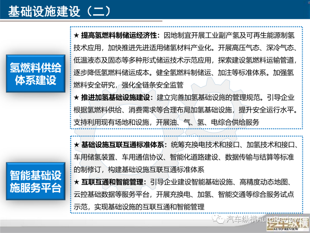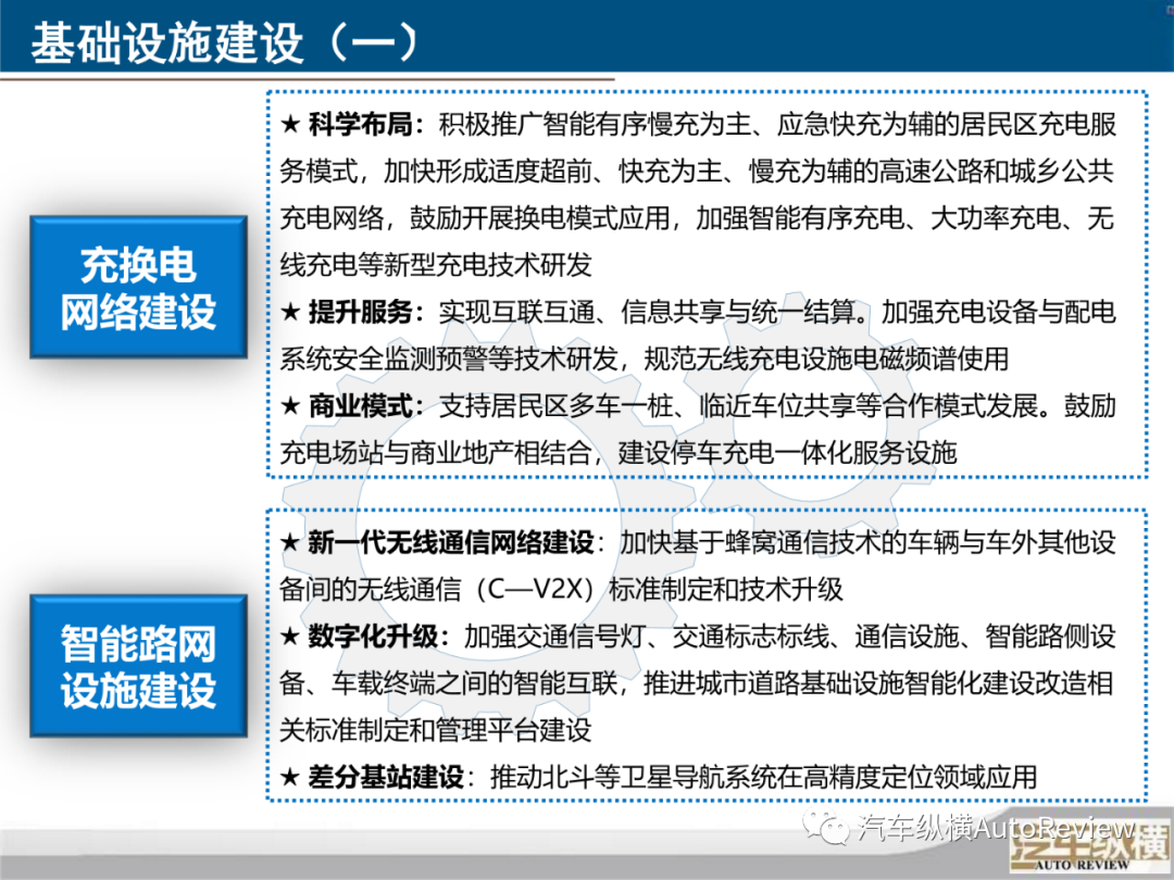 第一節(jié) 大力推動充換電網(wǎng)絡(luò)建設(shè)加快充換電基礎(chǔ)設(shè)施建設(shè)??茖W(xué)布局充換電基礎(chǔ)設(shè)施,加強(qiáng)與城鄉(xiāng)建設(shè)規(guī)劃、電網(wǎng)規(guī)劃及物業(yè)管理、城市停車等的統(tǒng)籌協(xié)調(diào)。依托“互聯(lián)網(wǎng)+”智慧能源,提升智能化水平,積極推廣智能有序慢充為主、應(yīng)急快充為輔的居民區(qū)充電服務(wù)模式,加快形成適度超前、快充為主、慢充為輔的高速公路和城鄉(xiāng)公共充電網(wǎng)絡(luò),鼓勵開展換電模式應(yīng)用,加強(qiáng)智能有序充電、大功率充電、無線充電等新型充電技術(shù)研發(fā),提高充電便利性和產(chǎn)品可靠性。提升充電基礎(chǔ)設(shè)施服務(wù)水平。引導(dǎo)企業(yè)聯(lián)合建立充電設(shè)施運(yùn)營服務(wù)平臺,實(shí)現(xiàn)互聯(lián)互通、信息共享與統(tǒng)一結(jié)算。加強(qiáng)充電設(shè)備與配電系統(tǒng)安全監(jiān)測預(yù)警等技術(shù)研發(fā),規(guī)范無線充電設(shè)施電磁頻譜使用,提高充電設(shè)施安全性、一致性、可靠性,提升服務(wù)保障水平。鼓勵商業(yè)模式創(chuàng)新。結(jié)合老舊小區(qū)改造、城市更新等工作,引導(dǎo)多方聯(lián)合開展充電設(shè)施建設(shè)運(yùn)營,支持居民區(qū)多車一樁、臨近車位共享等合作模式發(fā)展。鼓勵充電場站與商業(yè)地產(chǎn)相結(jié)合,建設(shè)停車充電一體化服務(wù)設(shè)施,提升公共場所充電服務(wù)能力,拓展增值服務(wù)。完善充電設(shè)施保險制度,降低企業(yè)運(yùn)營和用戶使用風(fēng)險。第二節(jié) 協(xié)調(diào)推動智能路網(wǎng)設(shè)施建設(shè)推進(jìn)新一代無線通信網(wǎng)絡(luò)建設(shè),加快基于蜂窩通信技術(shù)的車輛與車外其他設(shè)備間的無線通信(C—V2X)標(biāo)準(zhǔn)制定和技術(shù)升級。推進(jìn)交通標(biāo)志標(biāo)識等道路基礎(chǔ)設(shè)施數(shù)字化改造升級,加強(qiáng)交通信號燈、交通標(biāo)志標(biāo)線、通信設(shè)施、智能路側(cè)設(shè)備、車載終端之間的智能互聯(lián),推進(jìn)城市道路基礎(chǔ)設(shè)施智能化建設(shè)改造相關(guān)標(biāo)準(zhǔn)制定和管理平臺建設(shè)。加快差分基站建設(shè),推動北斗等衛(wèi)星導(dǎo)航系統(tǒng)在高精度定位領(lǐng)域應(yīng)用。第三節(jié) 有序推進(jìn)氫燃料供給體系建設(shè)提高氫燃料制儲運(yùn)經(jīng)濟(jì)性。因地制宜開展工業(yè)副產(chǎn)氫及可再生能源制氫技術(shù)應(yīng)用,加快推進(jìn)先進(jìn)適用儲氫材料產(chǎn)業(yè)化。開展高壓氣態(tài)、深冷氣態(tài)、低溫液態(tài)及固態(tài)等多種形式儲運(yùn)技術(shù)示范應(yīng)用,探索建設(shè)氫燃料運(yùn)輸管道,逐步降低氫燃料儲運(yùn)成本。健全氫燃料制儲運(yùn)、加注等標(biāo)準(zhǔn)體系。加強(qiáng)氫燃料安全研究,強(qiáng)化全鏈條安全監(jiān)管。推進(jìn)加氫基礎(chǔ)設(shè)施建設(shè)。建立完善加氫基礎(chǔ)設(shè)施的管理規(guī)范。引導(dǎo)企業(yè)根據(jù)氫燃料供給、消費(fèi)需求等合理布局加氫基礎(chǔ)設(shè)施,提升安全運(yùn)行水平。支持利用現(xiàn)有場地和設(shè)施,開展油、氣、氫、電綜合供給服務(wù)。