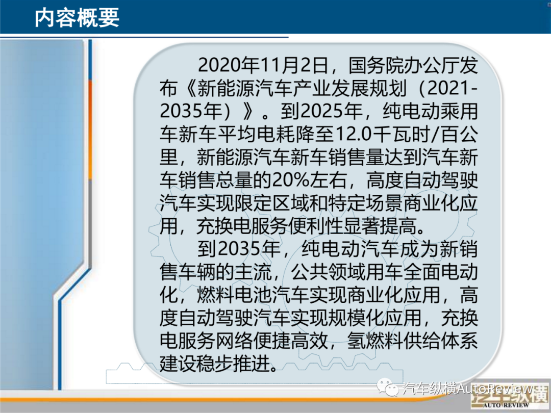 2020年11月2日,國務(wù)院辦公廳正式發(fā)布《新能源汽車產(chǎn)業(yè)發(fā)展規(guī)劃(2021—2035年)》。《規(guī)劃》提出,到2025年,純電動乘用車新車平均電耗降至12.0千瓦時/百公里,新能源汽車新車銷售量達(dá)到汽車新車銷售總量的20%左右,高度自動駕駛汽車實(shí)現(xiàn)限定區(qū)域和特定場景商業(yè)化應(yīng)用。到2035年,純電動汽車成為新銷售車輛的主流,公共領(lǐng)域用車全面電動化,燃料電池汽車實(shí)現(xiàn)商業(yè)化應(yīng)用,高度自動駕駛汽車實(shí)現(xiàn)規(guī)?;瘧?yīng)用,有效促進(jìn)節(jié)能減排水平和社會運(yùn)行效率的提升。