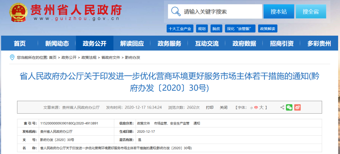 近日,貴州省人民政府辦公廳下發(fā)《關(guān)于印發(fā)進一步優(yōu)化營商環(huán)境更好服務(wù)市場主體若干措施的通知》。