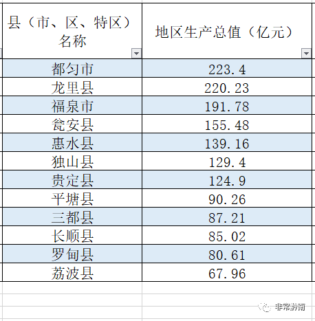 2021年2月18日,貴州省統(tǒng)計(jì)局發(fā)布了《2020年全省縣域經(jīng)濟(jì)回穩(wěn)向好》一文,其中包含了全省2020年88個(gè)縣地區(qū)生產(chǎn)總值。其中黔南情況如下: