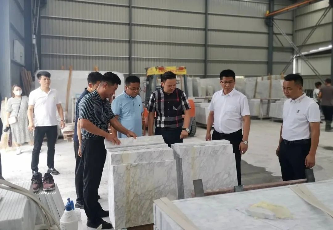 ▲石磊(右二)率隊考察石材市場