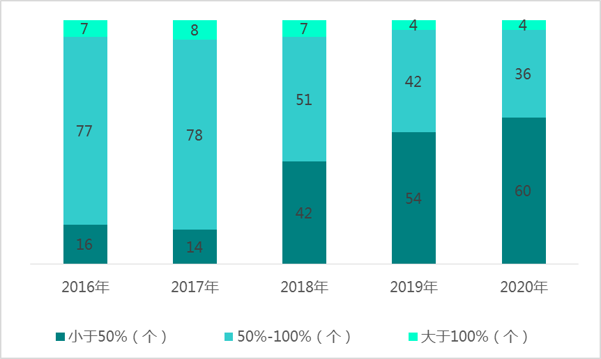 2016-2020年百強縣固定資產(chǎn)投資占GDP比重數(shù)量分布