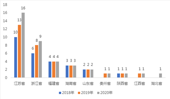 2018-2020年中國各省“千億縣”數(shù)量變化