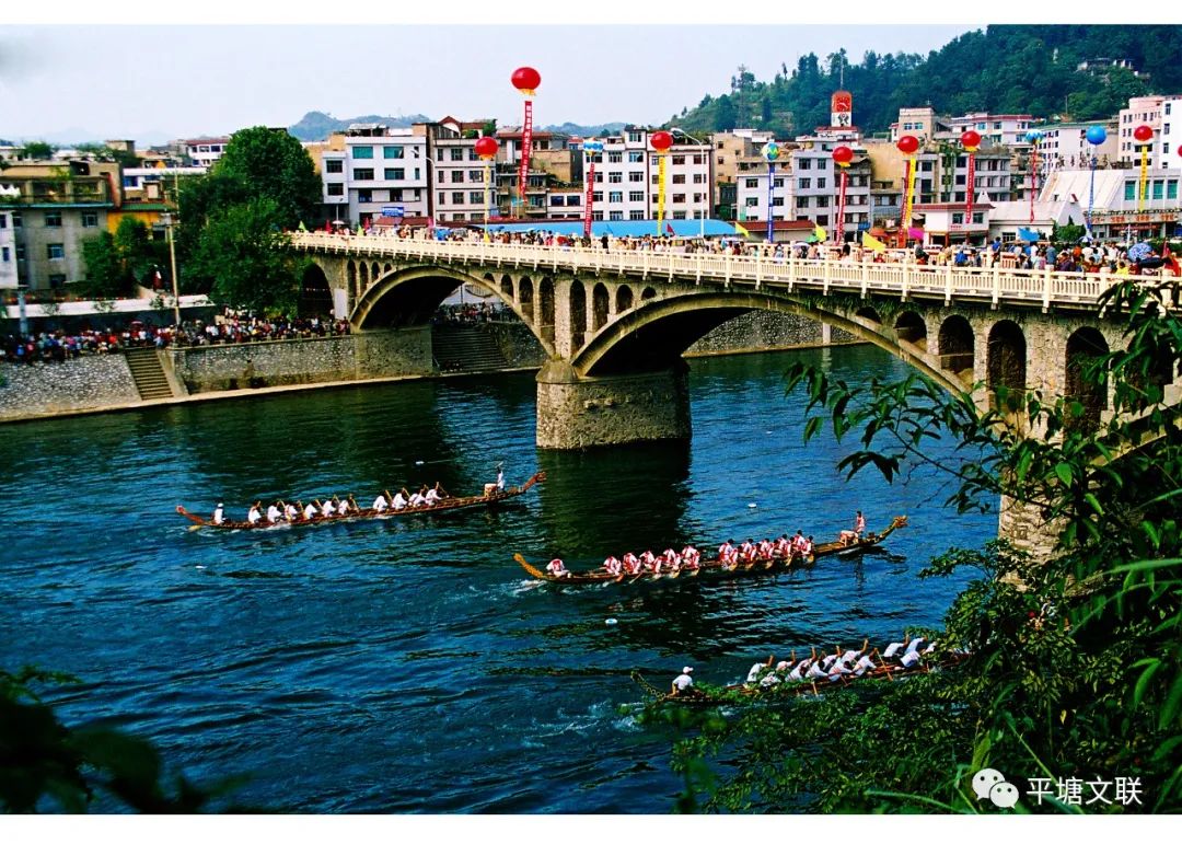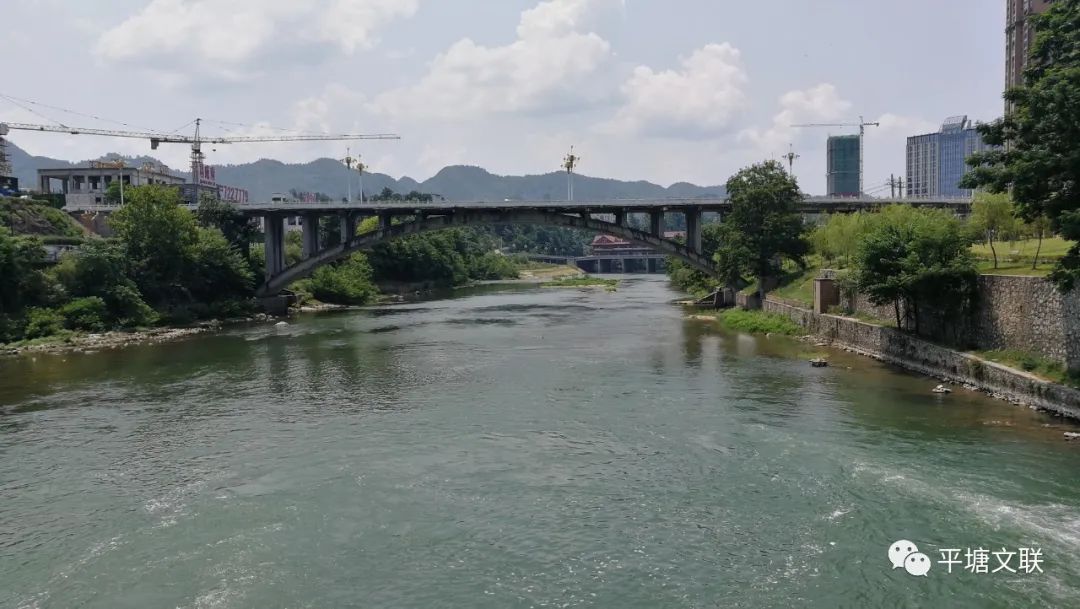 新舟大橋,位于縣城邊上的平舟河上,橋西為原平湖鎮(zhèn)新舟村新舟寨與望沙寨結合部,橋東為城區(qū)下街,是當時縣城連接平湖區(qū)新舟村及縣城西部地區(qū)的主要通道,現(xiàn)為老縣城與新城區(qū)之間的主要通道。據(jù)《平塘縣志》“橋梁”426頁記載:“平塘大橋即新舟大橋,由三孔跨度35米雙曲拱和三孔跨度10米石拱組成,長167米、寬9米、高16米,1970年11月開工,1972年7月竣工。大橋由黔南州交通局設計并指導施工,平塘縣組織施工,投資32萬元(含4萬元的引進路建設)?!贝髽蛑砸谝浴捌教痢钡目h名,沒有一個統(tǒng)一的說法,我猜想,可能是因為這座橋是平塘縣境內(nèi)第一座最長的孔橋,又是建在縣城邊上,所以稱為平塘大橋,但民間還是稱為新舟大橋,因為“平塘大橋”太籠統(tǒng)、不具體。