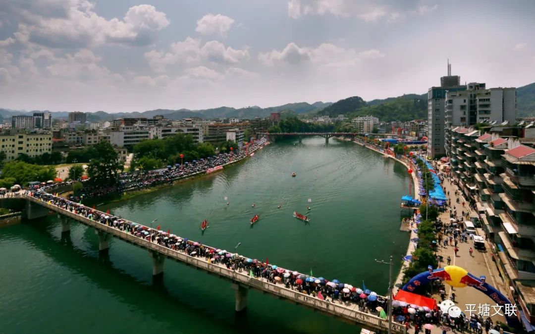 平塘縣城是一座水繞山環(huán)的城池,平舟河自東北向西南順縣城邊上流過,也就是說,整座縣城的東北、西、西南三面是河流環(huán)繞的,有“玉水金盆”的美譽。上世紀七十年代即在新舟大橋建成之前,縣城通往東北、西北面的只有一座橋梁——上梭大橋(北門大橋)。上梭大橋建于1958年,現(xiàn)在仍在使用,橋長128.4米、寬7.5米、高13.4米,為鋼筋混凝土T型板梁橋(平橋),上梭大橋距新舟大橋3000來米。