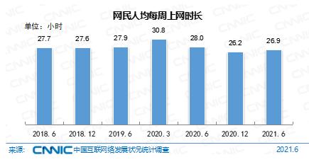 此外,報(bào)告顯示,截至2021年6月,我國網(wǎng)民的人均每周上網(wǎng)時(shí)長為26.9個(gè)小時(shí),較2020年12月提升0.7個(gè)小時(shí)。