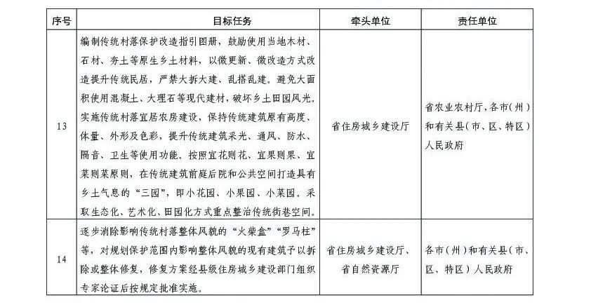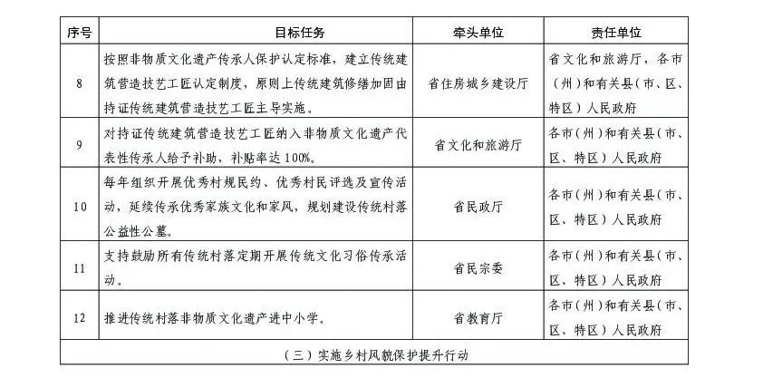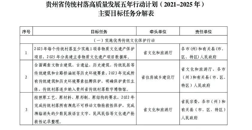 (一)實(shí)施優(yōu)秀傳統(tǒng)文化保護(hù)行動(dòng)。深入挖掘農(nóng)耕、服飾、飲食、歌舞、家訓(xùn)等非物質(zhì)文化遺產(chǎn)資源,積極申報(bào)納入非物質(zhì)文化遺產(chǎn)保護(hù)名錄,2023年每個(gè)傳統(tǒng)村落至少實(shí)施1項(xiàng)非物質(zhì)文化遺產(chǎn)保護(hù)項(xiàng)目,2025年分類建立非物質(zhì)文化遺產(chǎn)項(xiàng)目數(shù)據(jù)庫(kù)。全面調(diào)查文物古建筑、古遺址、歷史建筑、傳統(tǒng)民居等傳統(tǒng)建筑和古路橋涵垣等歷史環(huán)境要素,2023年完成所有傳統(tǒng)建筑和歷史環(huán)境要素掛牌保護(hù),明確保護(hù)責(zé)任主體,傳統(tǒng)村落逐步納入貴州省傳統(tǒng)村落數(shù)字博物館。按照原工藝、原材料、原形制、原結(jié)構(gòu)的要求,2022年完成傳統(tǒng)村落所有瀕危不可移動(dòng)文物搶救性保護(hù),完成瀕臨消失的少數(shù)民族語(yǔ)言文字、民風(fēng)民俗等文化遺產(chǎn)搶救性記錄整理。保護(hù)傳統(tǒng)文化依存場(chǎng)所和載體的原真性,嚴(yán)禁將大廣場(chǎng)、大牌坊等嫁接到傳統(tǒng)村落,禁止沒(méi)有依據(jù)的重建和仿制。積極配合檢察機(jī)關(guān)加大行政公益訴訟力度,依法監(jiān)督地方政府落實(shí)主體責(zé)任。將傳統(tǒng)村落納入地方志指導(dǎo)編纂內(nèi)容,2023年實(shí)現(xiàn)地方志編纂全覆蓋。嚴(yán)格執(zhí)行《貴州省傳統(tǒng)村落保護(hù)和發(fā)展條例》等法律法規(guī),依法嚴(yán)格查處各類違法建設(shè)破壞行為。