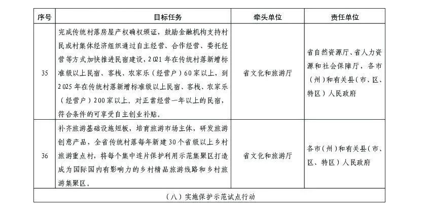 (七)實(shí)施旅游產(chǎn)業(yè)提升行動(dòng)。將傳統(tǒng)村落作為發(fā)展鄉(xiāng)村旅游的重點(diǎn),有序發(fā)展觀光、民宿、農(nóng)耕體驗(yàn)、傳統(tǒng)手工藝等旅游業(yè)態(tài),促進(jìn)群眾增收致富。組織編制集中連片保護(hù)利用示范集聚區(qū)旅游產(chǎn)業(yè)發(fā)展規(guī)劃,推動(dòng)其落地見效。依托傳統(tǒng)手工技藝和特色食品等民族文化資源,開發(fā)創(chuàng)新傳統(tǒng)村落旅游文創(chuàng)產(chǎn)品,傳承民間手工技藝,完善文創(chuàng)體驗(yàn)設(shè)施,打造20個(gè)以上“貴銀”“苗繡”“黔菜”等特色旅游示范村。完成傳統(tǒng)村落房屋產(chǎn)權(quán)確權(quán)頒證,鼓勵(lì)金融機(jī)構(gòu)支持村民或村集體經(jīng)濟(jì)組織通過(guò)自主經(jīng)營(yíng)、合作經(jīng)營(yíng)、委托經(jīng)營(yíng)等方式加快推進(jìn)民宿建設(shè),2021年在傳統(tǒng)村落新增標(biāo)準(zhǔn)級(jí)以上民宿、客棧、農(nóng)家樂(lè)(經(jīng)營(yíng)戶)60家以上,到2025年在傳統(tǒng)村落新增標(biāo)準(zhǔn)級(jí)以上民宿、客棧、農(nóng)家樂(lè)(經(jīng)營(yíng)戶)200家以上。對(duì)正常經(jīng)營(yíng)一年以上的民宿,符合條件的可享受自主創(chuàng)業(yè)補(bǔ)貼。補(bǔ)齊旅游基礎(chǔ)設(shè)施短板,培育旅游市場(chǎng)主體,研發(fā)旅游創(chuàng)意產(chǎn)品,全省傳統(tǒng)村落每年新建30個(gè)省級(jí)以上鄉(xiāng)村旅游重點(diǎn)村,將每個(gè)集中連片保護(hù)利用示范集聚區(qū)打造成為國(guó)際國(guó)內(nèi)有影響力的鄉(xiāng)村精品旅游線路和鄉(xiāng)村旅游集聚區(qū)。