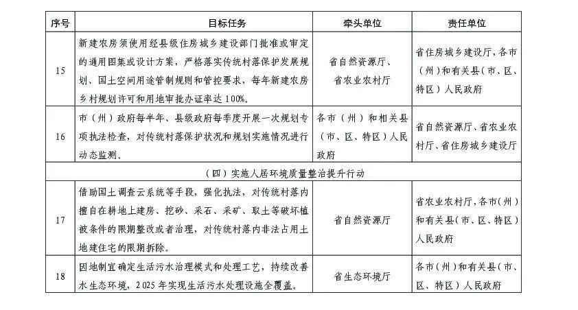 (四)實(shí)施人居環(huán)境質(zhì)量整治提升行動(dòng)。借助國(guó)土調(diào)查云系統(tǒng)等手段,強(qiáng)化執(zhí)法,對(duì)傳統(tǒng)村落內(nèi)擅自在耕地上建房、挖砂、采石、采礦、取土等破壞植被條件的限期整改或者治理,對(duì)傳統(tǒng)村落內(nèi)非法占用土地建住宅的限期拆除。因地制宜確定生活污水治理模式和處理工藝,持續(xù)改善水生態(tài)環(huán)境,2025年實(shí)現(xiàn)生活污水處理設(shè)施全覆蓋。健全傳統(tǒng)村落生活垃圾收運(yùn)設(shè)施,推進(jìn)生活垃圾減量化、資源化,生活垃圾實(shí)現(xiàn)應(yīng)收盡收。傳統(tǒng)村落戶廁實(shí)現(xiàn)衛(wèi)生達(dá)標(biāo),同步實(shí)施衛(wèi)浴改造,集中連片保護(hù)利用示范集聚區(qū)公廁按照旅游星級(jí)標(biāo)準(zhǔn)實(shí)現(xiàn)全覆蓋。傳統(tǒng)村落面源污染基本實(shí)現(xiàn)有效治理,2023年畜禽糞污綜合利用率達(dá)80%以上。中央農(nóng)村環(huán)境綜合整治項(xiàng)目資金優(yōu)先向傳統(tǒng)村落傾斜,支持傳統(tǒng)村落環(huán)境整治申報(bào)貴州省綠色生態(tài)環(huán)?;稹?/p>