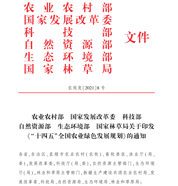 2021年9月7日,農(nóng)業(yè)農(nóng)村部、國(guó)家發(fā)展改革委、科技部、自然資源部、生態(tài)環(huán)境部、國(guó)家林草局聯(lián)合印發(fā)《“十四五”全國(guó)農(nóng)業(yè)綠色發(fā)展規(guī)劃》(以下簡(jiǎn)稱《規(guī)劃》)。這是我國(guó)首部農(nóng)業(yè)綠色發(fā)展專項(xiàng)規(guī)劃,對(duì)“十四五”農(nóng)業(yè)綠色發(fā)展工作作出系統(tǒng)部署和具體安排。