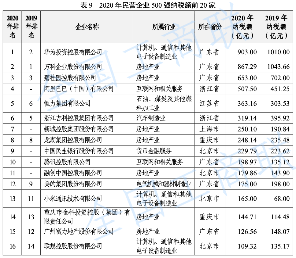 納稅額超過500億元的企業(yè)共4家,分別是:華為投資控股有限公司(903.00億元)、萬科企業(yè)股份有限公司(867.29億元)、碧桂園控股有限公司(653.00億元)、阿里巴巴(中國)有限公司(507.50億元)。