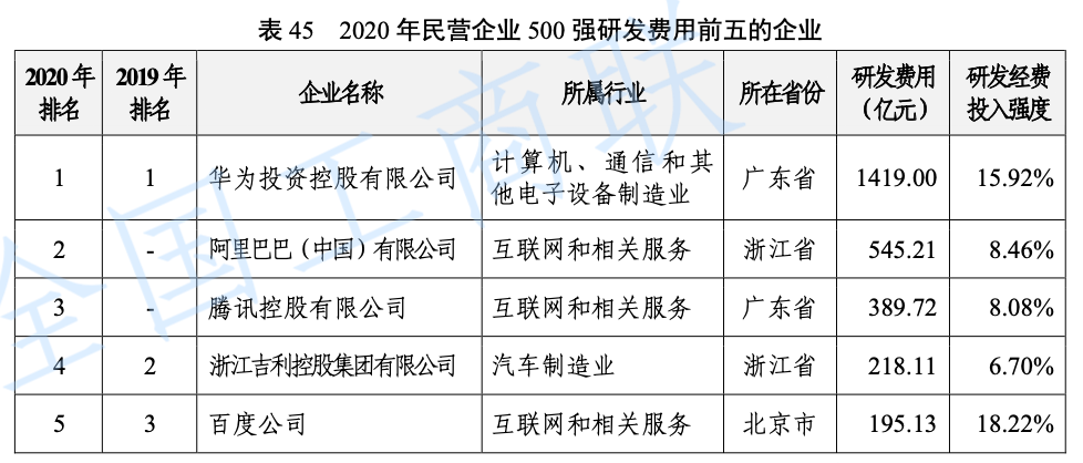 民營企業(yè)500強(qiáng)中,研發(fā)人員占員工總數(shù)超過3%的企業(yè)229家,超過10%的企業(yè)120家。研發(fā)經(jīng)費(fèi)投入強(qiáng)度超過3%的企業(yè)62家,超過10%的企業(yè)7家。