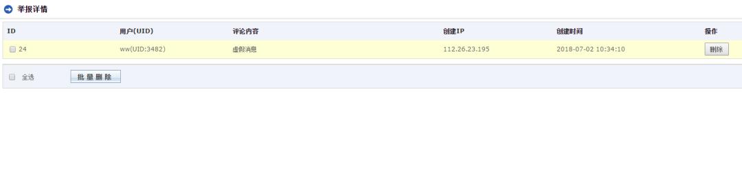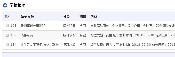 另外新增舉報功能,可以對垃圾帖子、有害帖子、虛假帖子進(jìn)行舉報。對于用戶舉報的信息、平臺運維人員可以在后臺模塊→同城信息→舉報管理查看,若該信息屬于有害違規(guī)信息,平臺運維人員對信息進(jìn)行查看、分析以及刪除等操作。