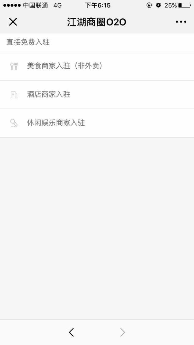 新版本商圈在個人中心界面新增了商家入駐功能,商家可選擇自己對應(yīng)的行業(yè)進(jìn)行入住,包括美食商家、酒店商家和休閑娛樂商家三個分類(酒店商家入駐、休閑娛樂商家入駐功能暫時還在開發(fā),后期會加上)。
