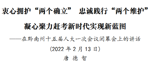 各位代表,同志們!回望來時路,我們在以習(xí)近平同志為核心的黨中央堅強領(lǐng)導(dǎo)下攜手開創(chuàng)了黔南發(fā)展史上極為不易、極不平凡、極其關(guān)鍵的五年。踏上新征程,黨中央、國務(wù)院為我們送來了新國發(fā)2號文件——《關(guān)于支持貴州在新時代西部大開發(fā)上闖新路的意見》這份沉甸甸的虎年“大禮包”,為指導(dǎo)當(dāng)前和今后一個時期我省經(jīng)濟社會高質(zhì)量發(fā)展提供了綱領(lǐng)性文件,必將對我省奮力闖新路開新局搶新機出新績,圍繞“四新”主攻“四化”,推動經(jīng)濟社會高質(zhì)量發(fā)展,與全國同步基本實現(xiàn)社會主義現(xiàn)代化起到巨大推動作用,這再次充分體現(xiàn)了習(xí)近平總書記對貴州對貴州各族群眾的親切關(guān)懷和殷切期望,充分體現(xiàn)了黨中央、國務(wù)院對我們的極大關(guān)心、高度重視和大力支持,讓我們倍感振奮、備受鼓舞,讓我們更加發(fā)自內(nèi)心地感恩總書記、感恩黨中央。展望新未來,我們要切實把思想和行動統(tǒng)一到州第十二次黨代會和本次大會部署上來,持續(xù)從百年黨史中汲取智慧和力量,搶抓新國發(fā)2號文件機遇,以永不懈怠的精神狀態(tài)和一往無前的奮斗姿態(tài)趕考新時代、實現(xiàn)新藍圖,將感恩之情轉(zhuǎn)化為擁戴核心之志、拼搏奮進之力、推動發(fā)展之責(zé),努力讓重大政策紅利變成發(fā)展的“真金白銀”,努力把“施工圖”變成“實景圖”,奮力書寫貴州高質(zhì)量發(fā)展新“黃金十年”的黔南篇章。