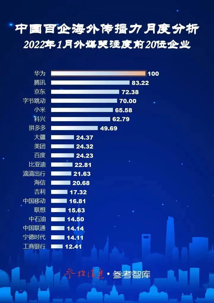 1月號報告顯示,國際營商環(huán)境、經(jīng)濟(jì)發(fā)展態(tài)勢、行業(yè)趨勢及媒體報道數(shù)量、報道媒體數(shù)量等成為影響企業(yè)海外傳播力及品牌形象的重要因素。1月,境外媒體關(guān)注度最高企業(yè)為華為、騰訊、京東、字節(jié)跳動、小米、科興等,比亞迪、中石油、中國移動等企業(yè)也為外媒重點關(guān)注。