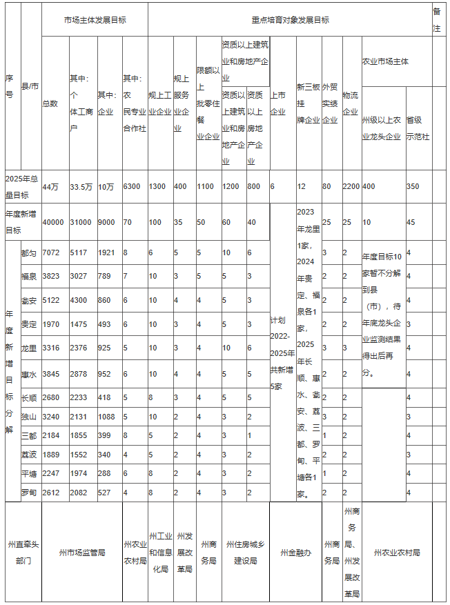 按照《國務院關(guān)于支持貴州在新時代西部大開發(fā)上闖新路的意見》(國發(fā)〔2022〕2號)有關(guān)要求,把市場主體培育作為圍繞“四新”主攻“四化”主抓手,聚焦規(guī)上工業(yè)、規(guī)上服務業(yè)、限額以上批零住餐、資質(zhì)以上建筑業(yè)、資質(zhì)以上房地產(chǎn)企業(yè)、上市企業(yè)、外貿(mào)業(yè)和物流業(yè)等重點行業(yè)、重點領(lǐng)域,著力營造良好營商、政策和法治環(huán)境。2022—2025年,全州年均新設立市場主體4萬戶以上,年均增速9%以上,到2025年超過44萬戶,進入全省前4位。其中,個體工商戶年均新設立3.1萬戶以上,年均增速9.8%以上,到2025年達到33.5萬戶;企業(yè)年均新設立9000戶以上,年均增速9.4%以上,到2025年達到10萬戶;農(nóng)民專業(yè)合作社扭轉(zhuǎn)負增長趨勢實現(xiàn)正向增長,年均新設立70戶以上,到2025年達到6300戶。(培育目標詳見附件)