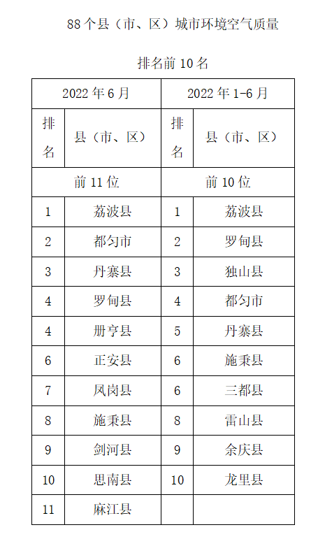 按環(huán)境空氣質(zhì)量綜合指數(shù)進行排序,2022年6月,9個中心城市環(huán)境空氣質(zhì)量排名依次為:都勻市、銅仁市、興義市、凱里市、安順市、六盤水市、貴陽市、遵義市、畢節(jié)市;88個縣(市、區(qū))城市環(huán)境空氣質(zhì)量相對較好的前11位(從第1名到第10名,含并列)為荔波縣、都勻市、丹寨縣、羅甸縣、冊亨縣、正安縣、鳳岡縣、施秉縣、劍河縣、思南縣、麻江縣。