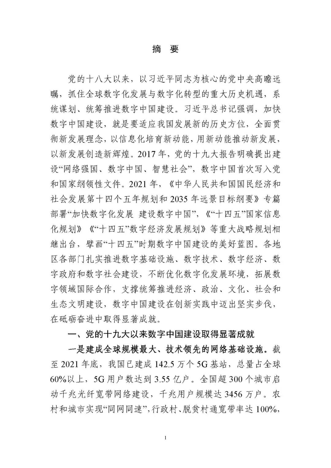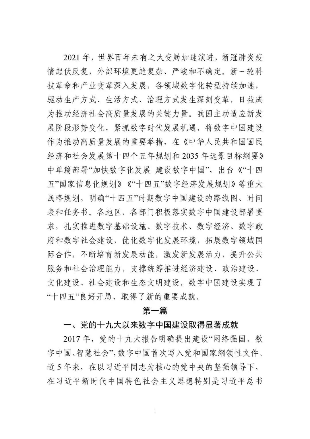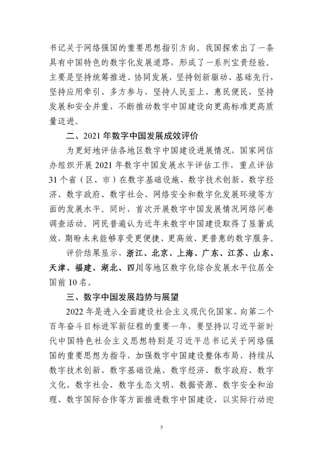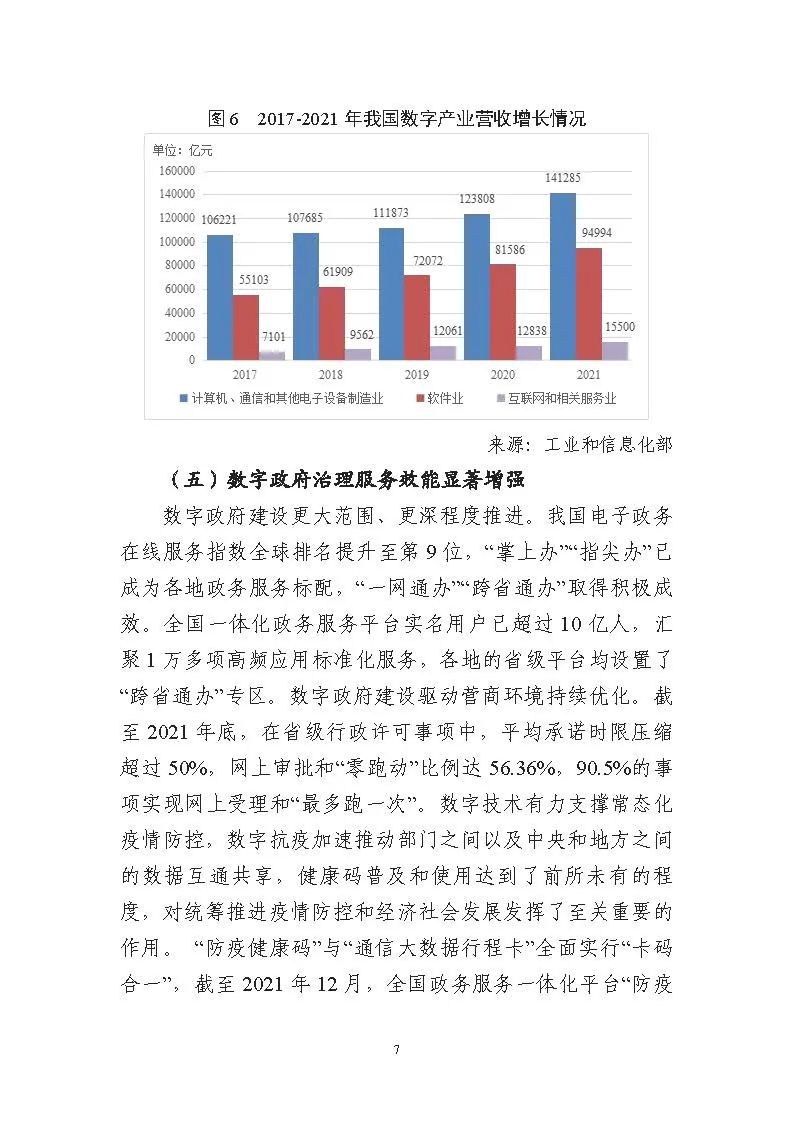 為貫徹落實(shí)黨中央、國務(wù)院關(guān)于建設(shè)數(shù)字中國的重要部署,深入實(shí)施《國家信息化發(fā)展戰(zhàn)略綱要》《“十四五”國家信息化規(guī)劃》等戰(zhàn)略規(guī)劃,國家互聯(lián)網(wǎng)信息辦公室會(huì)同有關(guān)方面跟蹤監(jiān)測(cè)各地區(qū)、各部門數(shù)字化發(fā)展情況,開展數(shù)字中國發(fā)展水平評(píng)估工作,編制完成《數(shù)字中國發(fā)展報(bào)告(2021年)》(以下簡(jiǎn)稱《報(bào)告》)?!秷?bào)告》總結(jié)了黨的十九大以來數(shù)字中國建設(shè)取得的顯著成就和2021年的重要進(jìn)展成效,評(píng)估了2021年各地區(qū)數(shù)字化發(fā)展水平,并對(duì)2022年數(shù)字中國建設(shè)進(jìn)行了展望?!秷?bào)告》全文如下:
