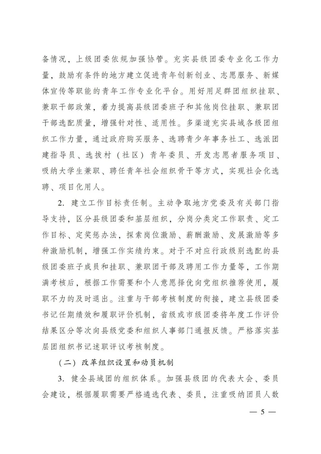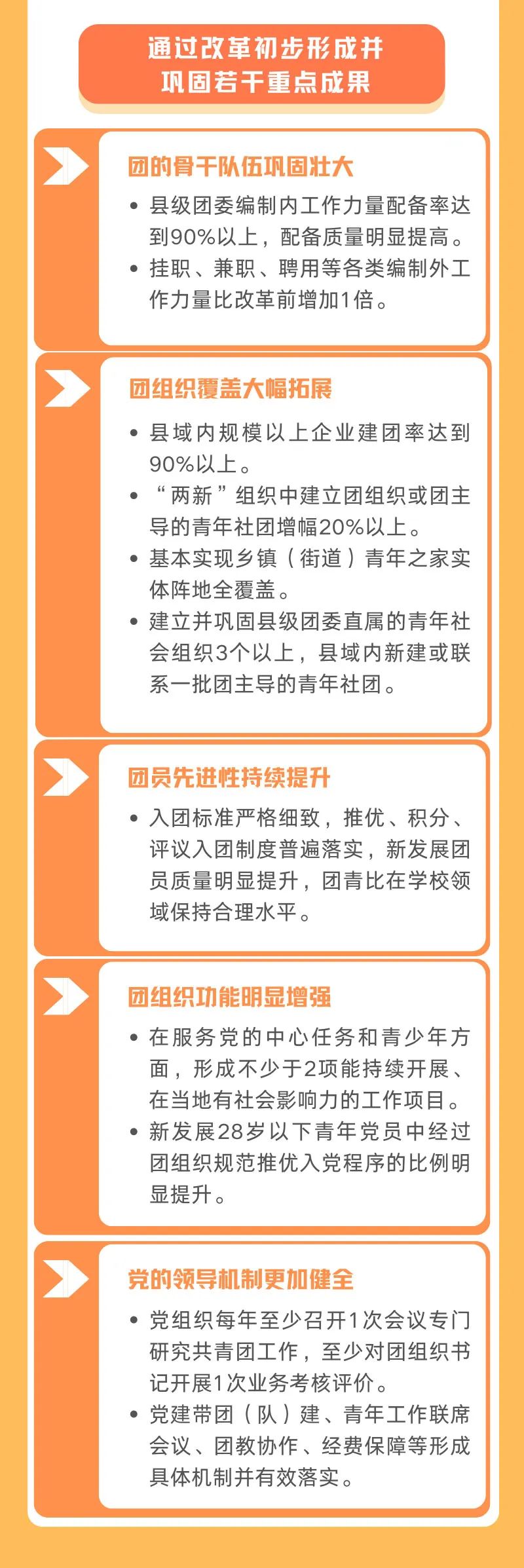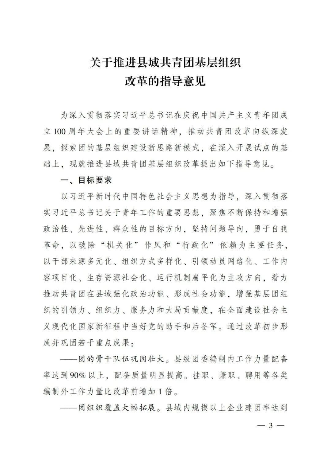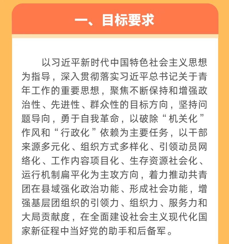 為深入貫徹落實習(xí)近平總書記在慶祝中國共產(chǎn)主義青年團(tuán)成立100周年大會上的重要講話精神,推動共青團(tuán)改革向縱深發(fā)展,探索團(tuán)的基層組織建設(shè)新思路新模式,在深入開展試點的基礎(chǔ)上,現(xiàn)就推進(jìn)縣域共青團(tuán)基層組織改革提出如下指導(dǎo)意見。 以習(xí)近平新時代中國特色社會主義思想為指導(dǎo),深入貫徹落實習(xí)近平總書記關(guān)于青年工作的重要思想,聚焦不斷保持和增強(qiáng)政治性、先進(jìn)性、群眾性的目標(biāo)方向,堅持問題導(dǎo)向,勇于自我革命,以破除“機(jī)關(guān)化”作風(fēng)和“行政化”依賴為主要任務(wù),以干部來源多元化、組織方式多樣化、引領(lǐng)動員網(wǎng)絡(luò)化、工作內(nèi)容項目化、生存資源社會化、運行機(jī)制扁平化為主攻方向,著力推動共青團(tuán)在縣域強(qiáng)化政治功能、形成社會功能,增強(qiáng)基層團(tuán)組織的引領(lǐng)力、組織力、服務(wù)力和大局貢獻(xiàn)度,在全面建設(shè)社會主義現(xiàn)代化國家新征程中當(dāng)好黨的助手和后備軍。通過改革初步形成并鞏固若干重點成果: ——團(tuán)的骨干隊伍鞏固壯大。縣級團(tuán)委編制內(nèi)工作力量配備率達(dá)到90%以上,配備質(zhì)量明顯提高。掛職、兼職、聘用等各類編制外工作力量比改革前增加1倍。 ——團(tuán)組織覆蓋大幅拓展。縣域內(nèi)規(guī)模以上企業(yè)建團(tuán)率達(dá)到90%以上,“兩新”組織中建立團(tuán)組織或團(tuán)主導(dǎo)的青年社團(tuán)增幅20%以上?;緦崿F(xiàn)鄉(xiāng)鎮(zhèn)(街道)青年之家實體陣地全覆蓋。建立并鞏固縣級團(tuán)委直屬的青年社會組織3個以上,縣域內(nèi)新建或聯(lián)系一批團(tuán)主導(dǎo)的青年社團(tuán)。 ——團(tuán)員先進(jìn)性持續(xù)提升。入團(tuán)標(biāo)準(zhǔn)嚴(yán)格細(xì)致,推優(yōu)、積分、評議入團(tuán)制度普遍落實,新發(fā)展團(tuán)員質(zhì)量明顯提升,團(tuán)青比在學(xué)校領(lǐng)域保持合理水平。 ——團(tuán)組織功能明顯增強(qiáng)。在服務(wù)黨的中心任務(wù)和青少年方面,形成不少于2項能持續(xù)開展、在當(dāng)?shù)赜猩鐣绊懥Φ墓ぷ黜椖?。新發(fā)展28歲以下青年黨員中經(jīng)過團(tuán)組織規(guī)范推優(yōu)入黨程序的比例明顯提升。 ——黨的領(lǐng)導(dǎo)機(jī)制更加健全。黨組織每年至少召開1次會議專門研究共青團(tuán)工作,至少對團(tuán)組織書記開展1次業(yè)務(wù)考核評價。黨建帶團(tuán)(隊)建、青年工作聯(lián)席會議、團(tuán)教協(xié)作、經(jīng)費保障等形成具體機(jī)制并有效落實。(一)改革團(tuán)的工作力量選用機(jī)制