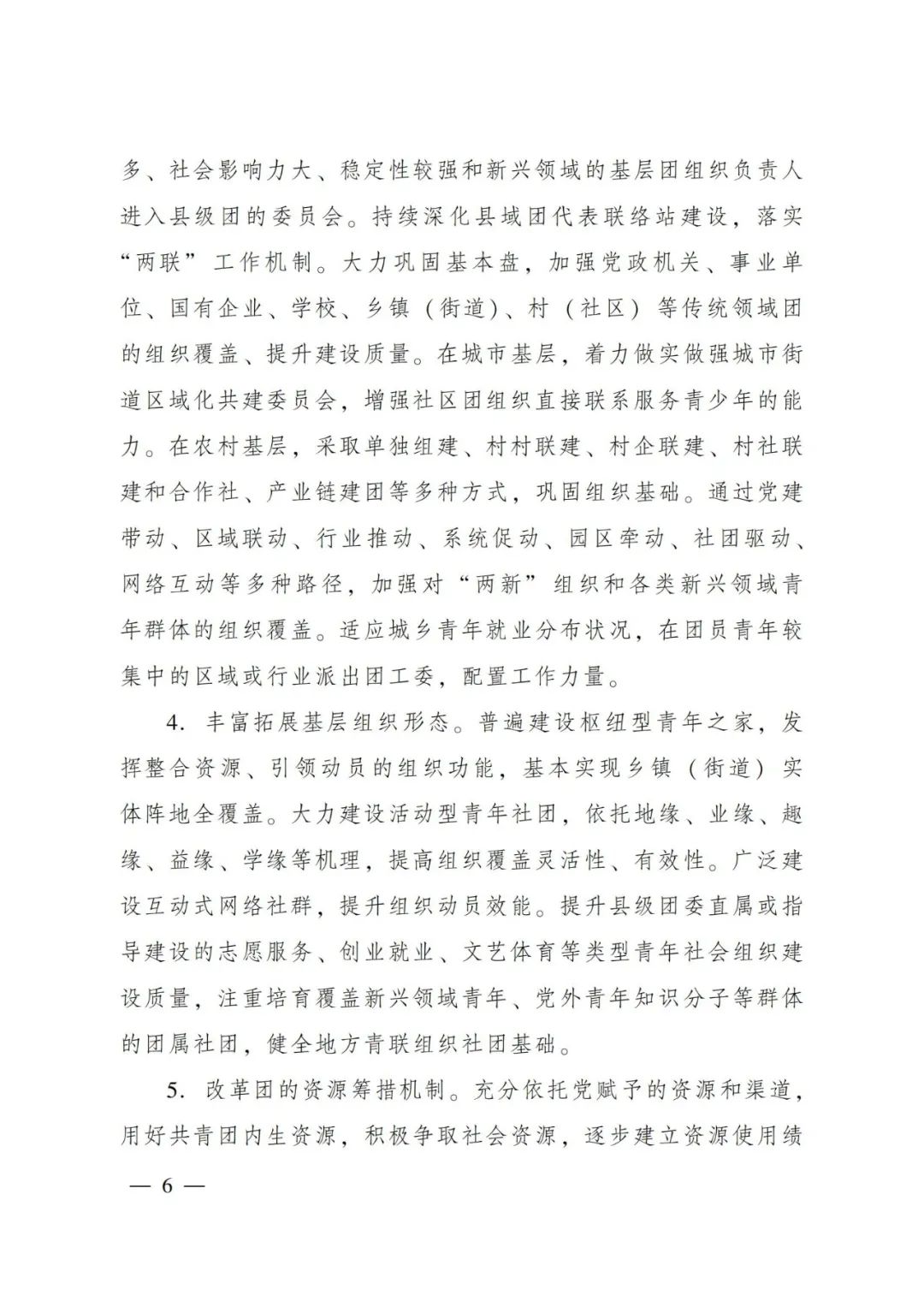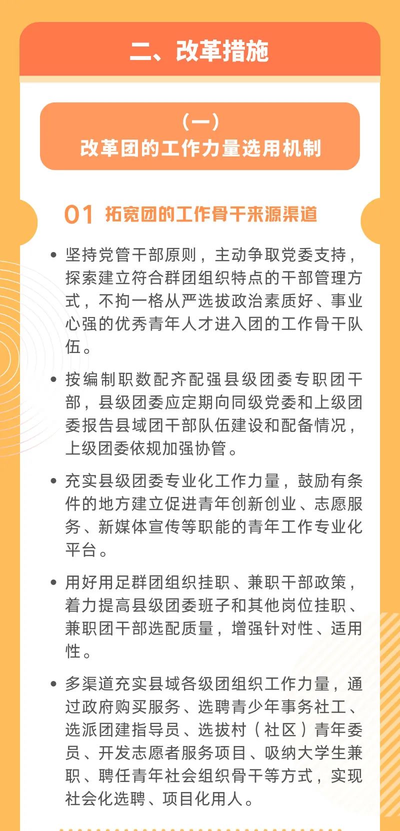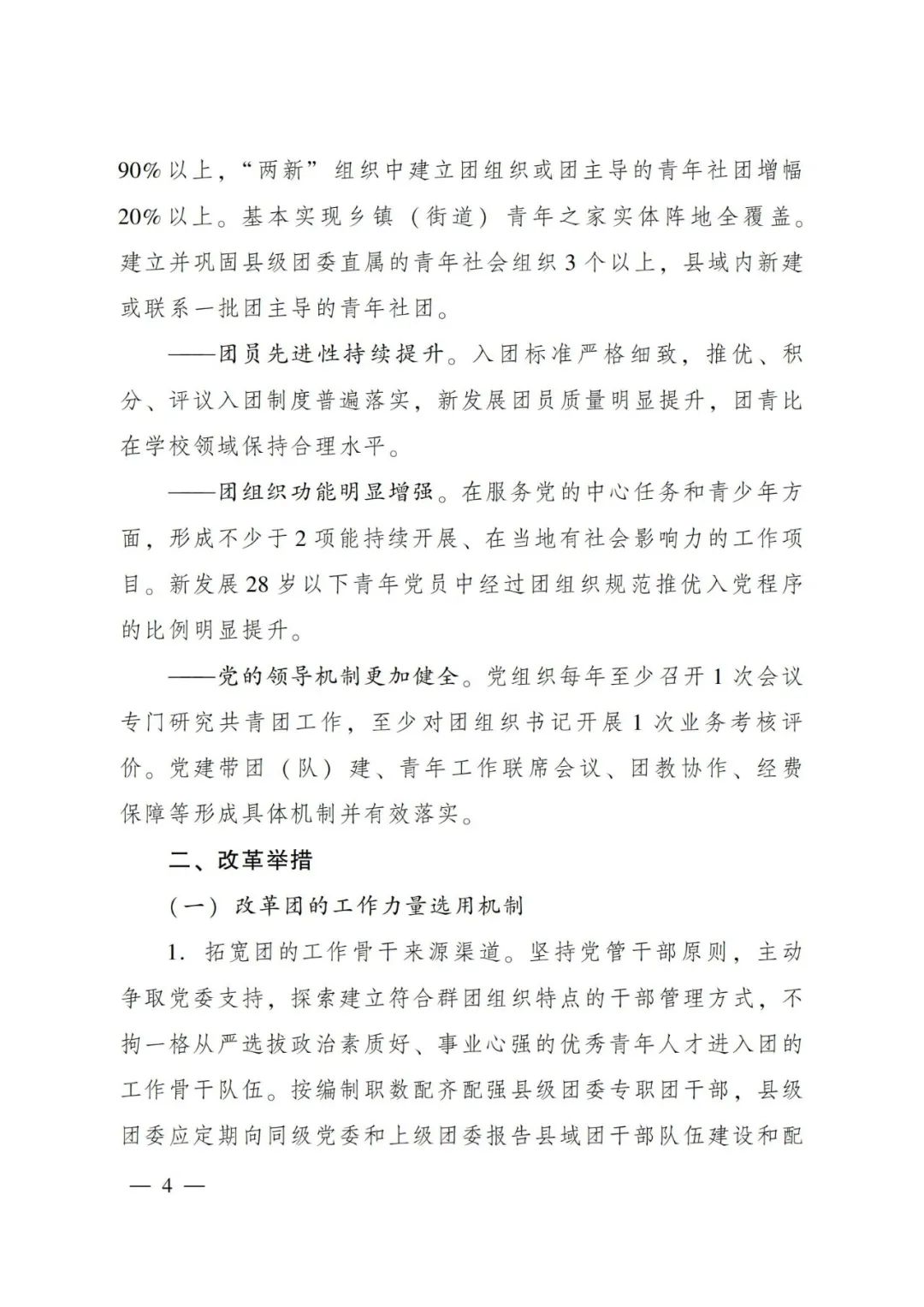 為深入貫徹落實習(xí)近平總書記在慶祝中國共產(chǎn)主義青年團(tuán)成立100周年大會上的重要講話精神,推動共青團(tuán)改革向縱深發(fā)展,探索團(tuán)的基層組織建設(shè)新思路新模式,在深入開展試點的基礎(chǔ)上,現(xiàn)就推進(jìn)縣域共青團(tuán)基層組織改革提出如下指導(dǎo)意見。 以習(xí)近平新時代中國特色社會主義思想為指導(dǎo),深入貫徹落實習(xí)近平總書記關(guān)于青年工作的重要思想,聚焦不斷保持和增強(qiáng)政治性、先進(jìn)性、群眾性的目標(biāo)方向,堅持問題導(dǎo)向,勇于自我革命,以破除“機(jī)關(guān)化”作風(fēng)和“行政化”依賴為主要任務(wù),以干部來源多元化、組織方式多樣化、引領(lǐng)動員網(wǎng)絡(luò)化、工作內(nèi)容項目化、生存資源社會化、運行機(jī)制扁平化為主攻方向,著力推動共青團(tuán)在縣域強(qiáng)化政治功能、形成社會功能,增強(qiáng)基層團(tuán)組織的引領(lǐng)力、組織力、服務(wù)力和大局貢獻(xiàn)度,在全面建設(shè)社會主義現(xiàn)代化國家新征程中當(dāng)好黨的助手和后備軍。通過改革初步形成并鞏固若干重點成果: ——團(tuán)的骨干隊伍鞏固壯大。縣級團(tuán)委編制內(nèi)工作力量配備率達(dá)到90%以上,配備質(zhì)量明顯提高。掛職、兼職、聘用等各類編制外工作力量比改革前增加1倍。 ——團(tuán)組織覆蓋大幅拓展。縣域內(nèi)規(guī)模以上企業(yè)建團(tuán)率達(dá)到90%以上,“兩新”組織中建立團(tuán)組織或團(tuán)主導(dǎo)的青年社團(tuán)增幅20%以上?;緦崿F(xiàn)鄉(xiāng)鎮(zhèn)(街道)青年之家實體陣地全覆蓋。建立并鞏固縣級團(tuán)委直屬的青年社會組織3個以上,縣域內(nèi)新建或聯(lián)系一批團(tuán)主導(dǎo)的青年社團(tuán)。 ——團(tuán)員先進(jìn)性持續(xù)提升。入團(tuán)標(biāo)準(zhǔn)嚴(yán)格細(xì)致,推優(yōu)、積分、評議入團(tuán)制度普遍落實,新發(fā)展團(tuán)員質(zhì)量明顯提升,團(tuán)青比在學(xué)校領(lǐng)域保持合理水平。 ——團(tuán)組織功能明顯增強(qiáng)。在服務(wù)黨的中心任務(wù)和青少年方面,形成不少于2項能持續(xù)開展、在當(dāng)?shù)赜猩鐣绊懥Φ墓ぷ黜椖?。新發(fā)展28歲以下青年黨員中經(jīng)過團(tuán)組織規(guī)范推優(yōu)入黨程序的比例明顯提升。 ——黨的領(lǐng)導(dǎo)機(jī)制更加健全。黨組織每年至少召開1次會議專門研究共青團(tuán)工作,至少對團(tuán)組織書記開展1次業(yè)務(wù)考核評價。黨建帶團(tuán)(隊)建、青年工作聯(lián)席會議、團(tuán)教協(xié)作、經(jīng)費保障等形成具體機(jī)制并有效落實。(一)改革團(tuán)的工作力量選用機(jī)制