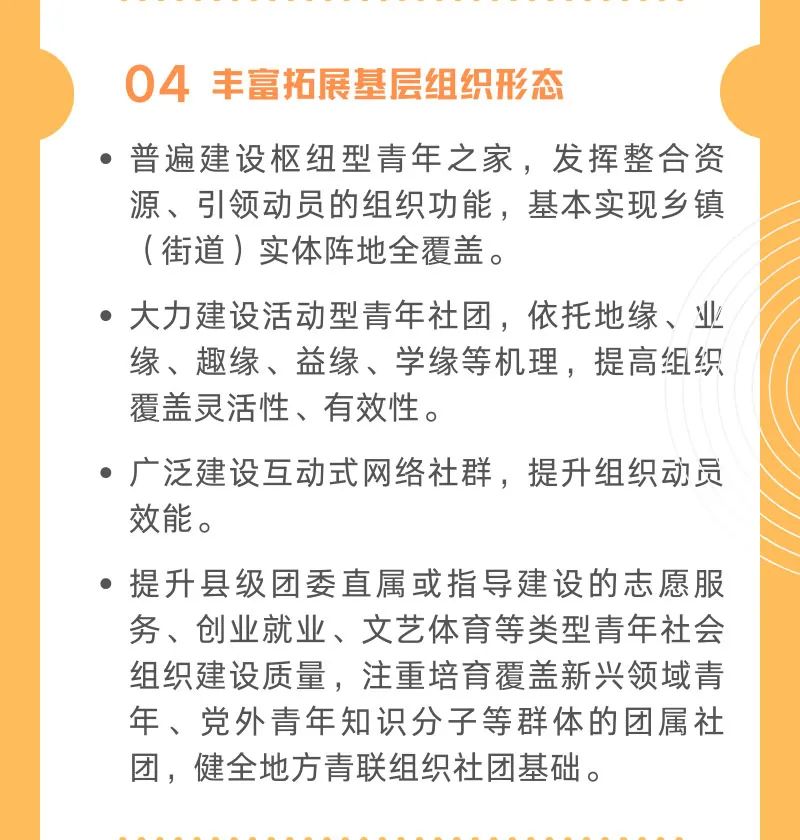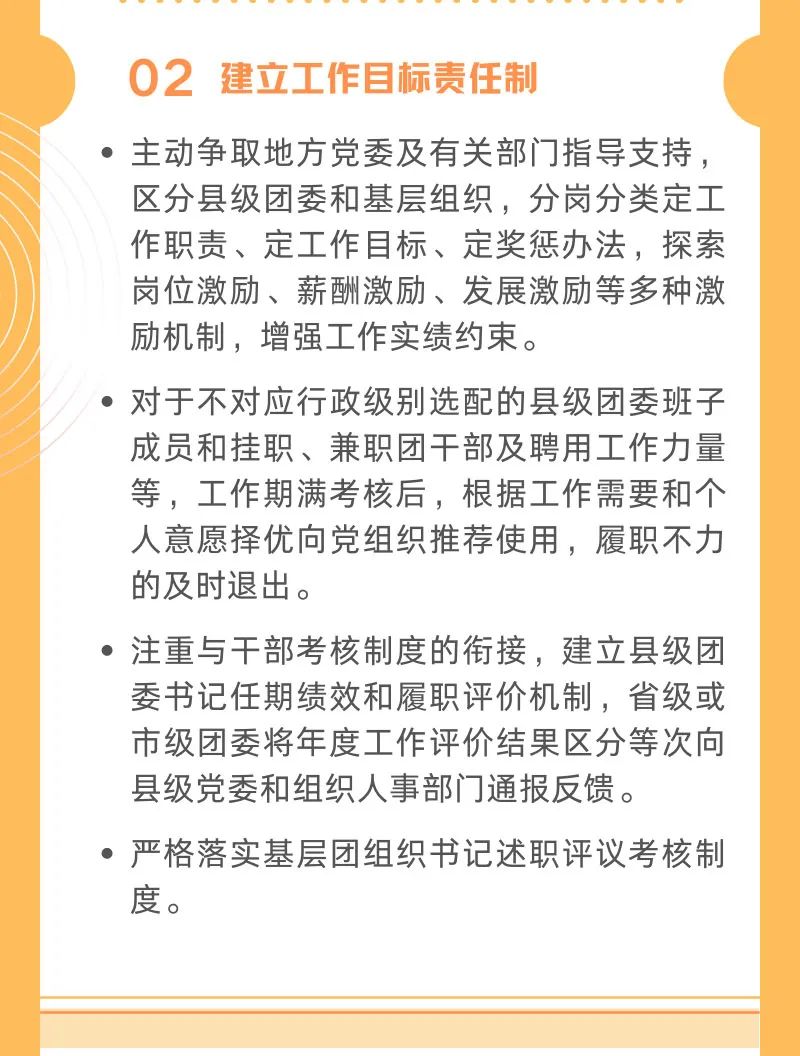 1. 拓寬團(tuán)的工作骨干來源渠道。堅持黨管干部原則,主動爭取黨委支持,探索建立符合群團(tuán)組織特點的干部管理方式,不拘一格從嚴(yán)選拔政治素質(zhì)好、事業(yè)心強(qiáng)的優(yōu)秀青年人才進(jìn)入團(tuán)的工作骨干隊伍。按編制職數(shù)配齊配強(qiáng)縣級團(tuán)委專職團(tuán)干部,縣級團(tuán)委應(yīng)定期向同級黨委和上級團(tuán)委報告縣域團(tuán)干部隊伍建設(shè)和配備情況,上級團(tuán)委依規(guī)加強(qiáng)協(xié)管。充實縣級團(tuán)委專業(yè)化工作力量,鼓勵有條件的地方建立促進(jìn)青年創(chuàng)新創(chuàng)業(yè)、志愿服務(wù)、新媒體宣傳等職能的青年工作專業(yè)化平臺。用好用足群團(tuán)組織掛職、兼職干部政策,著力提高縣級團(tuán)委班子和其他崗位掛職、兼職團(tuán)干部選配質(zhì)量,增強(qiáng)針對性、適用性。多渠道充實縣域各級團(tuán)組織工作力量,通過政府購買服務(wù)、選聘青少年事務(wù)社工、選派團(tuán)建指導(dǎo)員、選拔村(社區(qū))青年委員、開發(fā)志愿者服務(wù)項目、吸納大學(xué)生兼職、聘任青年社會組織骨干等方式,實現(xiàn)社會化選聘、項目化用人。 2. 建立工作目標(biāo)責(zé)任制。主動爭取地方黨委及有關(guān)部門指導(dǎo)支持,區(qū)分縣級團(tuán)委和基層組織,分崗分類定工作職責(zé)、定工作目標(biāo)、定獎懲辦法,探索崗位激勵、薪酬激勵、發(fā)展激勵等多種激勵機(jī)制,增強(qiáng)工作實績約束。對于不對應(yīng)行政級別選配的縣級團(tuán)委班子成員和掛職、兼職團(tuán)干部及聘用工作力量等,工作期滿考核后,根據(jù)工作需要和個人意愿擇優(yōu)向黨組織推薦使用,履職不力的及時退出。注重與干部考核制度的銜接,建立縣級團(tuán)委書記任期績效和履職評價機(jī)制,省級或市級團(tuán)委將年度工作評價結(jié)果區(qū)分等次向縣級黨委和組織人事部門通報反饋。嚴(yán)格落實基層團(tuán)組織書記述職評議考核制度。 3. 健全縣域團(tuán)的組織體系。加強(qiáng)縣級團(tuán)的代表大會、委員會建設(shè),根據(jù)履職需要嚴(yán)格遴選代表、委員,注重吸納團(tuán)員人數(shù)多、社會影響力大、穩(wěn)定性較強(qiáng)和新興領(lǐng)域的基層團(tuán)組織負(fù)責(zé)人進(jìn)入縣級團(tuán)的委員會。持續(xù)深化縣域團(tuán)代表聯(lián)絡(luò)站建設(shè),落實“兩聯(lián)”工作機(jī)制。大力鞏固基本盤,加強(qiáng)黨政機(jī)關(guān)、事業(yè)單位、國有企業(yè)、學(xué)校、鄉(xiāng)鎮(zhèn)(街道)、村(社區(qū))等傳統(tǒng)領(lǐng)域團(tuán)的組織覆蓋、提升建設(shè)質(zhì)量。在城市基層,著力做實做強(qiáng)城市街道區(qū)域化共建委員會,增強(qiáng)社區(qū)團(tuán)組織直接聯(lián)系服務(wù)青少年的能力。在農(nóng)村基層,采取單獨組建、村村聯(lián)建、村企聯(lián)建、村社聯(lián)建和合作社、產(chǎn)業(yè)鏈建團(tuán)等多種方式,鞏固組織基礎(chǔ)。通過黨建帶動、區(qū)域聯(lián)動、行業(yè)推動、系統(tǒng)促動、園區(qū)牽動、社團(tuán)驅(qū)動、網(wǎng)絡(luò)互動等多種路徑,加強(qiáng)對“兩新”組織和各類新興領(lǐng)域青年群體的組織覆蓋。適應(yīng)城鄉(xiāng)青年就業(yè)分布狀況,在團(tuán)員青年較集中的區(qū)域或行業(yè)派出團(tuán)工委,配置工作力量。 4. 豐富拓展基層組織形態(tài)。普遍建設(shè)樞紐型青年之家,發(fā)揮整合資源、引領(lǐng)動員的組織功能,基本實現(xiàn)鄉(xiāng)鎮(zhèn)(街道)實體陣地全覆蓋。大力建設(shè)活動型青年社團(tuán),依托地緣、業(yè)緣、趣緣、益緣、學(xué)緣等機(jī)理,提高組織覆蓋靈活性、有效性。廣泛建設(shè)互動式網(wǎng)絡(luò)社群,提升組織動員效能。提升縣級團(tuán)委直屬或指導(dǎo)建設(shè)的志愿服務(wù)、創(chuàng)業(yè)就業(yè)、文藝體育等類型青年社會組織建設(shè)質(zhì)量,注重培育覆蓋新興領(lǐng)域青年、黨外青年知識分子等群體的團(tuán)屬社團(tuán),健全地方青聯(lián)組織社團(tuán)基礎(chǔ)。 5. 改革團(tuán)的資源籌措機(jī)制。充分依托黨賦予的資源和渠道,用好共青團(tuán)內(nèi)生資源,積極爭取社會資源,逐步建立資源使用績效評價和監(jiān)督機(jī)制,提高社會化生存能力。鞏固黨政支持保障,完善政府購買青少年社會工作服務(wù)機(jī)制。采取扁平化、項目化方式,推進(jìn)各級團(tuán)的領(lǐng)導(dǎo)機(jī)關(guān)把力量和資源充實到基層,一體實施“小而實”的工作項目,為基層團(tuán)組織賦能。圍繞地方黨委中心任務(wù)和青少年需求,推動基層團(tuán)組織在鄉(xiāng)村振興、志愿服務(wù)、濟(jì)困助學(xué)、就業(yè)創(chuàng)業(yè)、人才培養(yǎng)、實踐育人等領(lǐng)域,打造常態(tài)開展、長期堅持、具有穩(wěn)定政治功能和社會影響力的項目品牌,切實幫助青少年解決“急難愁盼”問題,有效服務(wù)大局和青少年。