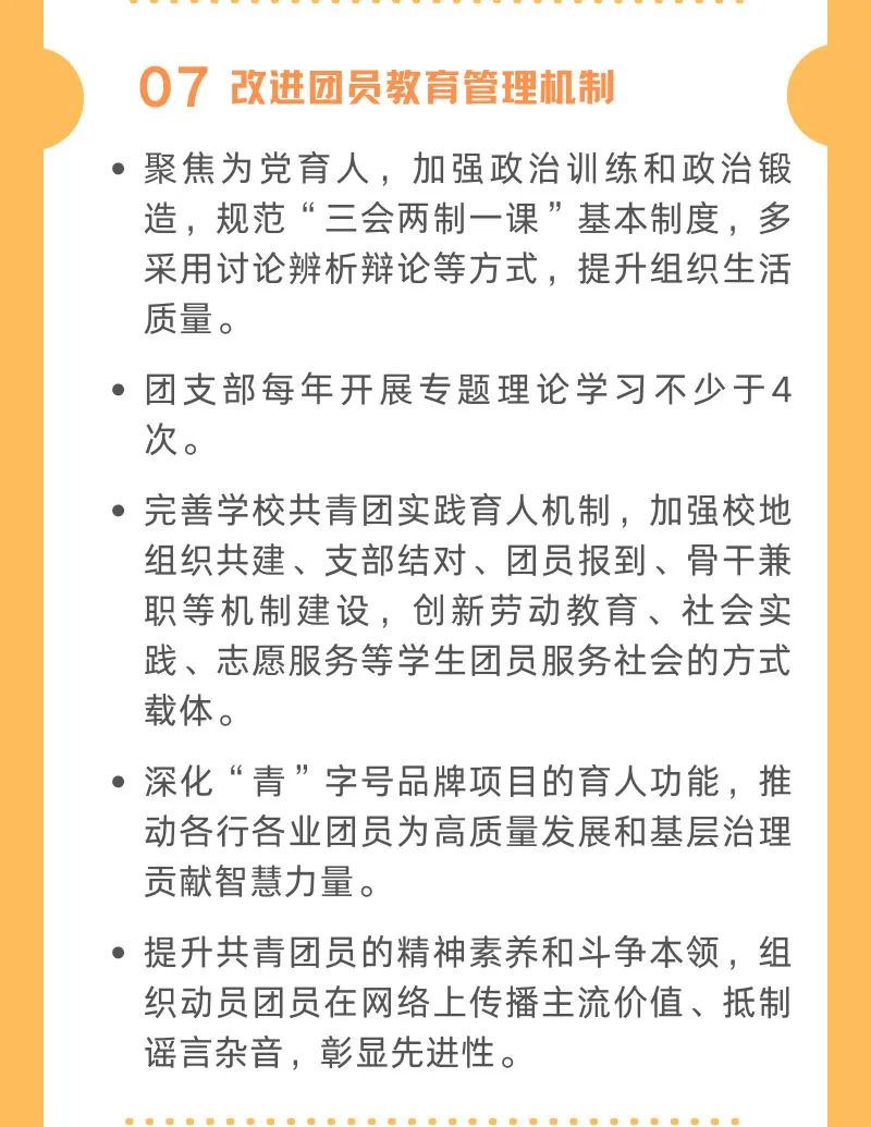 6. 嚴(yán)格入團(tuán)標(biāo)準(zhǔn)和程序。堅持政治標(biāo)準(zhǔn),建立并落實積分、評議入團(tuán)制度,落實少先隊推優(yōu)機(jī)制,逐步將思政課考評優(yōu)良、團(tuán)課學(xué)習(xí)合格、積極參與志愿服務(wù)作為入團(tuán)的必備條件,提高團(tuán)員發(fā)展質(zhì)量。優(yōu)化規(guī)模結(jié)構(gòu),重視初中、中職(技工)、民辦和農(nóng)村學(xué)校發(fā)展團(tuán)員工作,鞏固在初中畢業(yè)班及以上學(xué)段班級建立團(tuán)支部,加大社會領(lǐng)域團(tuán)員發(fā)展力度。嚴(yán)格團(tuán)員發(fā)展程序和工作紀(jì)律,從嚴(yán)從實做好違規(guī)發(fā)展團(tuán)員核查處置。 7. 改進(jìn)團(tuán)員教育管理機(jī)制。聚焦為黨育人,加強(qiáng)政治訓(xùn)練和政治鍛造,規(guī)范“三會兩制一課”基本制度,多采用討論辨析辯論等方式,提升組織生活質(zhì)量。團(tuán)支部每年開展專題理論學(xué)習(xí)不少于4次。完善學(xué)校共青團(tuán)實踐育人機(jī)制,加強(qiáng)校地組織共建、支部結(jié)對、團(tuán)員報到、骨干兼職等機(jī)制建設(shè),創(chuàng)新勞動教育、社會實踐、志愿服務(wù)等學(xué)生團(tuán)員服務(wù)社會的方式載體。深化“青”字號品牌項目的育人功能,推動各行各業(yè)團(tuán)員為高質(zhì)量發(fā)展和基層治理貢獻(xiàn)智慧力量。提升共青團(tuán)員的精神素養(yǎng)和斗爭本領(lǐng),組織動員團(tuán)員在網(wǎng)絡(luò)上傳播主流價值、抵制謠言雜音,彰顯先進(jìn)性。 8. 推動黨、團(tuán)、隊育人鏈條銜接貫通。加強(qiáng)全團(tuán)帶隊,落實少先隊階梯式成長激勵制度,遞進(jìn)開展分批入隊、分段教育、分級激勵。規(guī)范落實新時代共青團(tuán)激勵機(jī)制指導(dǎo)大綱,綜合實施入團(tuán)激勵、評議激勵、榮譽激勵、機(jī)會激勵、發(fā)展激勵,每年開展團(tuán)員先進(jìn)性評價。把推優(yōu)入黨作為基層團(tuán)組織履行政治功能的重要抓手,落實“兩個一般、兩個主要”要求,按照共青團(tuán)推優(yōu)入黨工作實施辦法,規(guī)范和加強(qiáng)推優(yōu)入黨工作機(jī)制,將共青團(tuán)員榮譽激勵和先進(jìn)性評價結(jié)果作為“推優(yōu)”的重要依據(jù)。