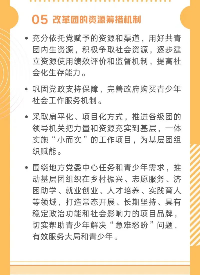 近日,經(jīng)黨中央同意,共青團(tuán)中央印發(fā)《關(guān)于推進(jìn)縣域共青團(tuán)基層組織改革的指導(dǎo)意見》(以下簡稱“指導(dǎo)意見”),全面部署推進(jìn)縣域共青團(tuán)基層組織改革。通知指出,黨的十八大以來,黨中央高度重視共青團(tuán)的基層建設(shè)和改革,習(xí)近平總書記多次要求全團(tuán)樹立大抓基層的鮮明導(dǎo)向,推動改革舉措落到基層,把力量和資源充實到基層,使基層真正強(qiáng)起來。2019年7月,中央書記處專題審議通過了《共青團(tuán)基層組織改革綜合試點方案》;2021年5月,經(jīng)中央領(lǐng)導(dǎo)同志同意,縣域共青團(tuán)基層組織改革試點擴(kuò)大至全國621個縣區(qū)。團(tuán)中央總結(jié)將近三年的實踐,提出了本指導(dǎo)意見。通知強(qiáng)調(diào),各級團(tuán)組織要堅持改革的正確方向,準(zhǔn)確領(lǐng)會改革意圖,抓住主要矛盾和關(guān)鍵問題,以干部來源多元化、組織方式多樣化、引領(lǐng)動員網(wǎng)絡(luò)化、工作內(nèi)容項目化、生存資源社會化、運行機(jī)制扁平化為主攻方向,強(qiáng)化政治功能、形成社會功能,持續(xù)提升基層團(tuán)組織的引領(lǐng)力、組織力、服務(wù)力和大局貢獻(xiàn)度,力爭明年年底前完成縣域共青團(tuán)基層組織改革任務(wù)??h域共青團(tuán)基層組織改革由省級團(tuán)委統(tǒng)籌,在縣(市、區(qū)、旗)黨委領(lǐng)導(dǎo)下實施,市、縣兩級團(tuán)委具體抓落實,省、市、縣團(tuán)委書記是第一責(zé)任人。通知要求,全體團(tuán)干部要發(fā)揚歷史主動,緊跟時代步伐,大膽解放思想,增強(qiáng)危機(jī)意識,勇于自我革命,忠實履行職責(zé),始終把工作基點建立在自我奮斗上,以時不我待的精氣神把各項改革任務(wù)落到實處,以本地區(qū)黨的青年工作改革發(fā)展的實效體現(xiàn)對黨的忠誠,以實際行動迎接黨的二十大勝利召開。指導(dǎo)意見明確了縣域共青團(tuán)基層組織改革的目標(biāo)要求。指出要以習(xí)近平新時代中國特色社會主義思想為指導(dǎo),深入貫徹落實習(xí)近平總書記關(guān)于青年工作的重要思想,聚焦不斷保持和增強(qiáng)政治性、先進(jìn)性、群眾性的目標(biāo)方向,堅持問題導(dǎo)向,勇于自我革命,以破除“機(jī)關(guān)化”作風(fēng)和“行政化”依賴為主要任務(wù),以干部來源多元化、組織方式多樣化、引領(lǐng)動員網(wǎng)絡(luò)化、工作內(nèi)容項目化、生存資源社會化、運行機(jī)制扁平化為主攻方向,著力推動共青團(tuán)在縣域強(qiáng)化政治功能、形成社會功能,增強(qiáng)基層團(tuán)組織的引領(lǐng)力、組織力、服務(wù)力和大局貢獻(xiàn)度,在全面建設(shè)社會主義現(xiàn)代化國家新征程中當(dāng)好黨的助手和后備軍。通過改革,在團(tuán)的骨干隊伍鞏固壯大、團(tuán)組織覆蓋大幅拓展、團(tuán)員先進(jìn)性持續(xù)提升、團(tuán)組織功能明顯增強(qiáng)、黨的領(lǐng)導(dǎo)機(jī)制更加健全等方面初步形成并鞏固若干重點成果。指導(dǎo)意見提出了四個方面、共9項改革舉措。改革團(tuán)的工作力量選用機(jī)制方面,重點拓寬團(tuán)的工作骨干來源渠道,堅持黨管干部原則,不拘一格從嚴(yán)選拔政治素質(zhì)好、事業(yè)心強(qiáng)的優(yōu)秀青年人才進(jìn)入團(tuán)的工作骨干隊伍;建立工作目標(biāo)責(zé)任制,區(qū)分縣級團(tuán)委和基層組織,分崗分類定工作職責(zé)、定工作目標(biāo)、定獎懲辦法,增強(qiáng)工作實績約束。改革組織設(shè)置和動員機(jī)制方面,重點健全縣域團(tuán)的組織體系,加強(qiáng)縣級團(tuán)的代表大會、委員會建設(shè),強(qiáng)化各個領(lǐng)域團(tuán)的組織覆蓋和建設(shè)質(zhì)量;豐富拓展基層組織形態(tài),大力建設(shè)樞紐型青年之家、活動型青年社團(tuán)、互動式網(wǎng)絡(luò)社群,培育團(tuán)屬青年社會組織,提升組織動員效能;改革團(tuán)的資源籌措機(jī)制,充分依托黨賦予的資源和渠道,用好共青團(tuán)內(nèi)生資源,積極爭取社會資源,提高社會化生存能力。改革團(tuán)員發(fā)展和教育管理機(jī)制方面,重點嚴(yán)格入團(tuán)標(biāo)準(zhǔn)和程序,堅持政治標(biāo)準(zhǔn),優(yōu)化規(guī)模結(jié)構(gòu),建立并落實積分、評議入團(tuán)制度;改進(jìn)團(tuán)員教育管理機(jī)制,聚焦為黨育人,加強(qiáng)政治訓(xùn)練和政治鍛造,提升組織生活質(zhì)量,團(tuán)支部每年開展專題理論學(xué)習(xí)不少于4次;推動黨、團(tuán)、隊育人鏈條銜接貫通,落實少先隊階梯式成長激勵制度和新時代共青團(tuán)激勵機(jī)制指導(dǎo)大綱,把推優(yōu)入黨作為基層團(tuán)組織履行政治功能的重要抓手。完善黨的領(lǐng)導(dǎo)機(jī)制方面,重點推動增強(qiáng)基層黨建帶團(tuán)建實效,定期聽取工作匯報,經(jīng)常研究重大問題,支持團(tuán)組織創(chuàng)造性開展工作,健全基層黨建帶團(tuán)(隊)建、青年工作聯(lián)席會議、團(tuán)教協(xié)作、經(jīng)費保障等重點機(jī)制,確保黨中央明確的規(guī)定動作落實到位。共青團(tuán)中央印發(fā)