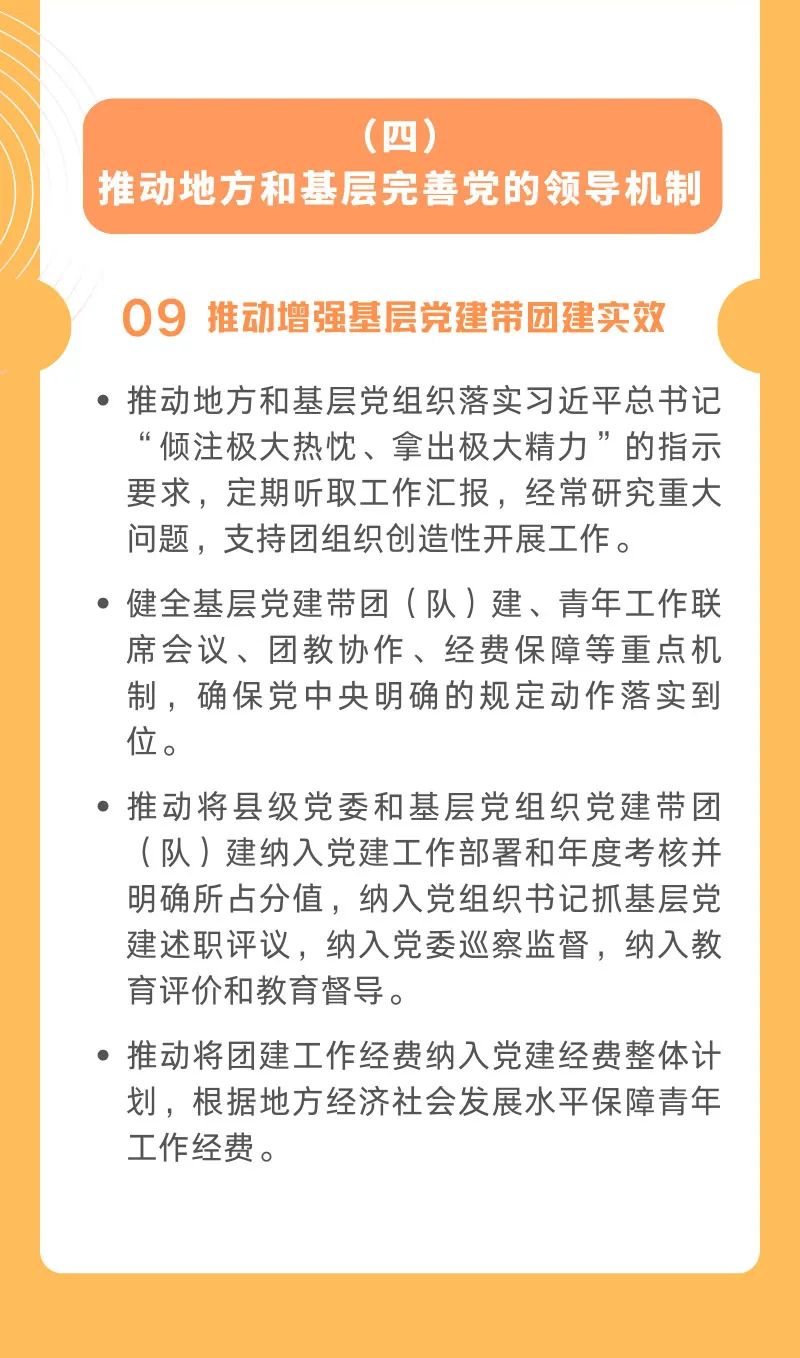 9. 推動增強(qiáng)基層黨建帶團(tuán)建實效。推動地方和基層黨組織落實習(xí)近平總書記“傾注極大熱忱、拿出極大精力”的指示要求,定期聽取工作匯報,經(jīng)常研究重大問題,支持團(tuán)組織創(chuàng)造性開展工作。健全基層黨建帶團(tuán)(隊)建、青年工作聯(lián)席會議、團(tuán)教協(xié)作、經(jīng)費保障等重點機(jī)制,確保黨中央明確的規(guī)定動作落實到位。推動將縣級黨委和基層黨組織黨建帶團(tuán)(隊)建納入黨建工作部署和年度考核并明確所占分值,納入黨組織書記抓基層黨建述職評議,納入黨委巡察監(jiān)督,納入教育評價和教育督導(dǎo)。推動將團(tuán)建工作經(jīng)費納入黨建經(jīng)費整體計劃,根據(jù)地方經(jīng)濟(jì)社會發(fā)展水平保障青年工作經(jīng)費。 縣域共青團(tuán)基層組織改革由省級團(tuán)委統(tǒng)籌,在縣(市、區(qū)、旗)黨委領(lǐng)導(dǎo)下實施,市、縣兩級團(tuán)委具體抓落實,2023年底基本完成。省、市、縣級團(tuán)委書記作為第一責(zé)任人,要主動爭取各方支持,推動各項措施納入黨委全面深化改革的整體格局。省、市、縣級團(tuán)委要依據(jù)本意見精神和地方實際,積極爭取黨委改革辦、紀(jì)檢監(jiān)察、組織、財政、民政、教育等部門的指導(dǎo)支持,制定具體保障措施,重點推動干部制度改革和納入改革督察、黨建考核、巡視巡察、購買服務(wù)等改革措施落地。 團(tuán)中央、省級團(tuán)委通過組建專班、集中培訓(xùn)、項目案例、交流觀摩等加強(qiáng)具體指導(dǎo),及時推廣改革好做法好經(jīng)驗,宣傳改革進(jìn)展和成效。建立改革情況向黨組織請示報告和溝通反饋機(jī)制,省、市、縣級團(tuán)委要將改革推進(jìn)情況作為向上級團(tuán)組織請示報告和主要負(fù)責(zé)同志年度述職考核的重要內(nèi)容。落實全面從嚴(yán)治團(tuán)要求,對改革重視不夠、推進(jìn)緩慢的團(tuán)組織及其主要負(fù)責(zé)同志,要及時提醒約談、督促整改;不履行或不正確履行職責(zé)導(dǎo)致改革嚴(yán)重滯后的應(yīng)嚴(yán)肅追責(zé)問責(zé)。西部陸海新通道經(jīng)濟(jì)帶,中國天眼,東方瑞士,山地公園省,醉美多彩貴州風(fēng),數(shù)字中國云上貴州省智慧黔南州大美獨山縣匯特通知身邊鄉(xiāng)村振興電子商務(wù)大數(shù)據(jù)百姓生活便民信息新聞網(wǎng)訊