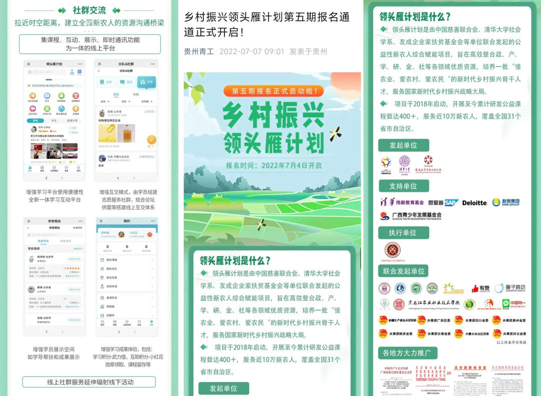 “鄉(xiāng)村振興領(lǐng)頭雁計(jì)劃”是由中國(guó)慈善聯(lián)合會(huì)、清華大學(xué)社會(huì)學(xué)系、友成企業(yè)家扶貧基金會(huì)等單位聯(lián)合發(fā)起的民間公益培訓(xùn)項(xiàng)目,于2018年9月啟動(dòng)實(shí)施。項(xiàng)目通過“互聯(lián)網(wǎng)+”模式,對(duì)返鄉(xiāng)創(chuàng)業(yè)青年、農(nóng)村基層干部、合作社及駐村企業(yè)負(fù)責(zé)人等新農(nóng)人開展全面、系統(tǒng)的培訓(xùn),解決其就業(yè)創(chuàng)業(yè)過程中存在的實(shí)際問題,旨在培養(yǎng)一批“懂農(nóng)業(yè)、愛農(nóng)村、愛農(nóng)民”的新農(nóng)人骨干,助力鄉(xiāng)村振興。線上培訓(xùn)結(jié)束后,主辦方邀請(qǐng)知名教授和企業(yè)高管在清華校園開展“領(lǐng)頭雁計(jì)劃精英工作坊”培訓(xùn),給優(yōu)秀學(xué)員代表答疑解惑、傳經(jīng)送寶。