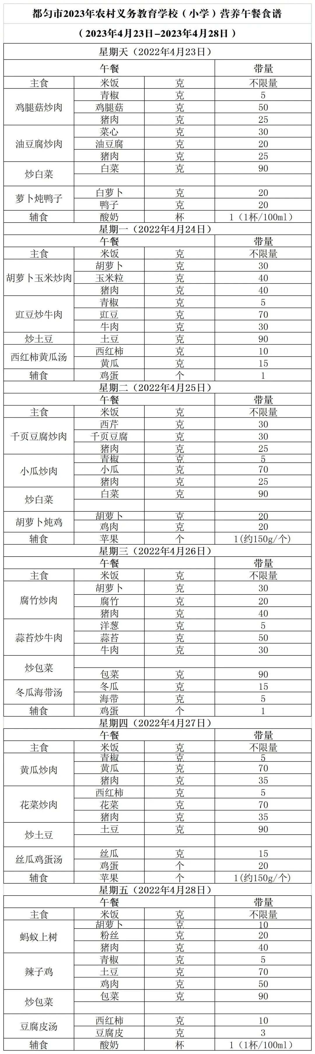 貴州省黔南州都勻市2023年4月23日至4月28日義務(wù)教育學(xué)生營(yíng)養(yǎng)午餐食譜公示
