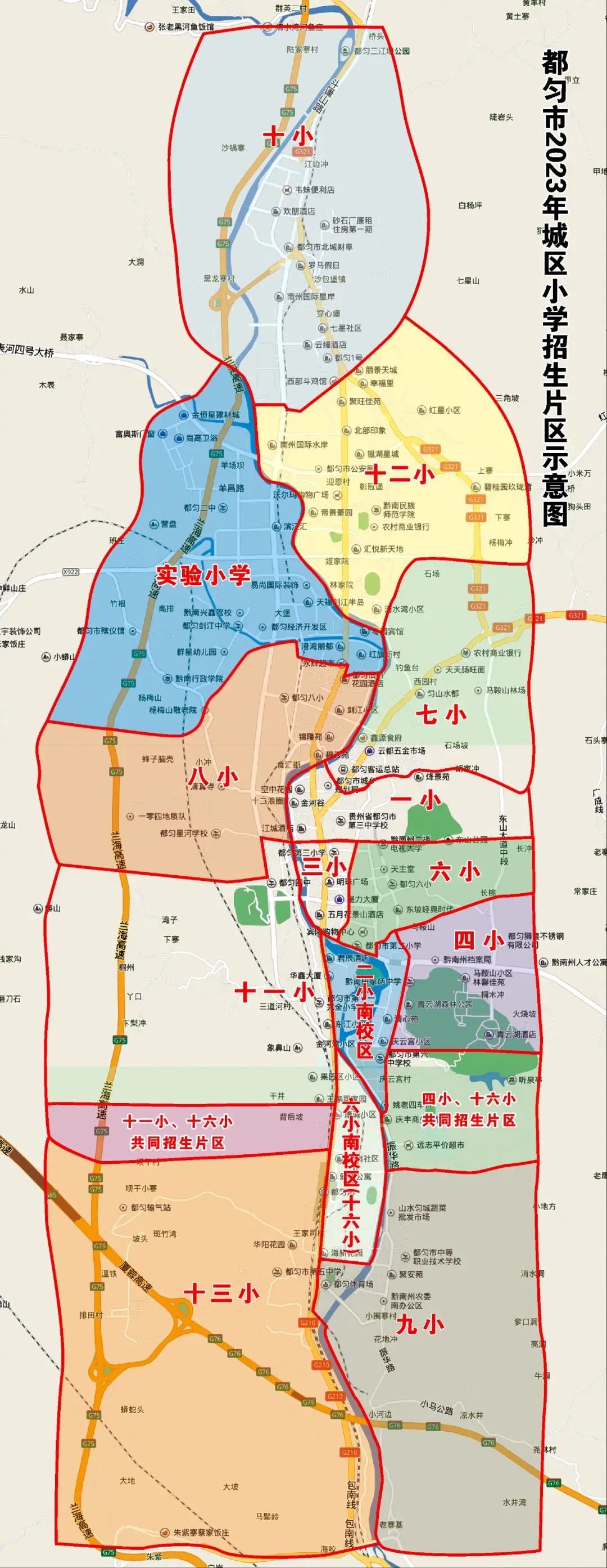 二是將都勻十一小原招生片區(qū)從西山大橋東橋頭至大十字,再從大十字向南沿劍江大道至都勻斜橋北橋頭,西面以劍江河為界的三角地段劃歸都勻三小。