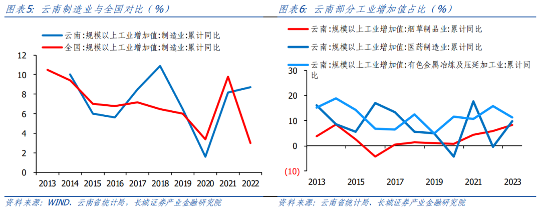 醫(yī)藥制造業(yè)發(fā)展?jié)摿Υ蟆?/span>云南市值排名前20的上市公司中,有三家醫(yī)藥制造企業(yè),其中包括龍頭企業(yè)云南白藥。2022年醫(yī)藥制造業(yè)同比增長-0.5%高于全國的-1.4%。云政辦在2022年3月發(fā)布的《云南省“十四五”生物醫(yī)藥產業(yè)創(chuàng)新發(fā)展規(guī)劃》中闡述,云南作為中國的“藥材之鄉(xiāng)”、“生物基因寶庫”,是生物資源、天然藥物和民族醫(yī)藥資源最豐富的省份。全國第三次中藥資源普查統(tǒng)計發(fā)現,全省中藥材資源種類有6559種,占全國種類總數的51.4%,為此政府將生物醫(yī)藥產業(yè)作為重點培育的戰(zhàn)略性新興產業(yè),引導創(chuàng)新,開放合作,預計2025年,將生物醫(yī)藥產業(yè)年均增加值保持在10%左右。