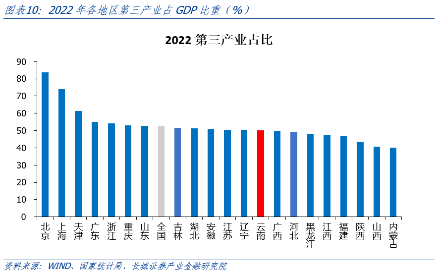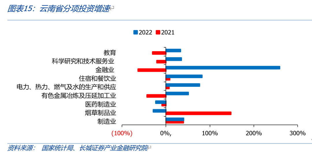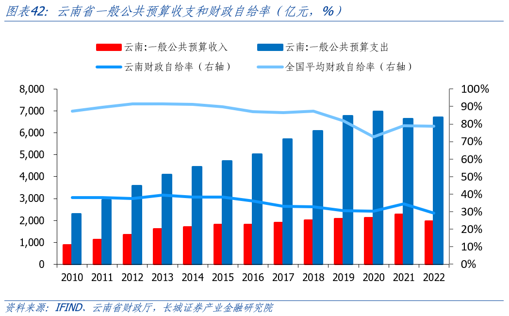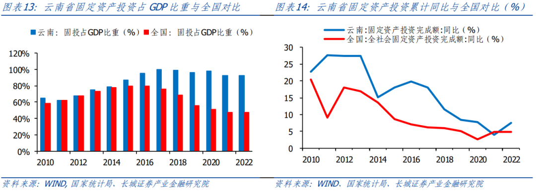 云南省固定投資完成額占GDP比重持續(xù)高于全國。我們用全國和云南不含農戶的固定資產投資完成額作為衡量標準。從國家統(tǒng)計局公布的數據顯示,云南固投從2010年的0.51萬億元增加到2022年的2.69萬億元,年平均增速14.97%,高于全國的7.46%。近十年,固投占GDP比重平均在85%,遠高于全國的65%,且在2017年達到峰值(99.94%)。據2022年云南省國民經濟和社會發(fā)展統(tǒng)計公報,固定資產投資增速最快的是金融業(yè),為258.8%,制造業(yè)/住宿餐飲業(yè)/有色金屬金屬冶煉及壓延加工業(yè)同比增速分別為40.3%/82%/50.9%,煙草制品業(yè)和醫(yī)藥制造業(yè)同比下滑28.7%和23.5%,但增速都相對較高。根據云南地方金融管理局今年3月發(fā)布的公告提到,旅游固定資產投資完成1053.2億元,增速居全國第一。