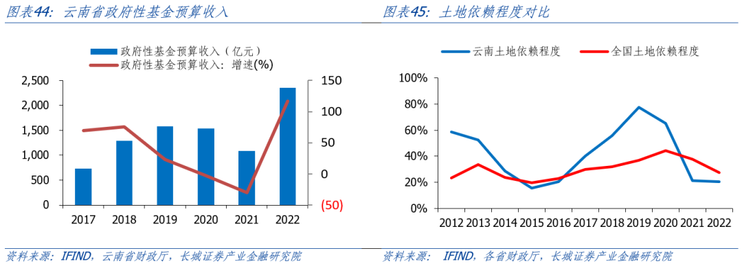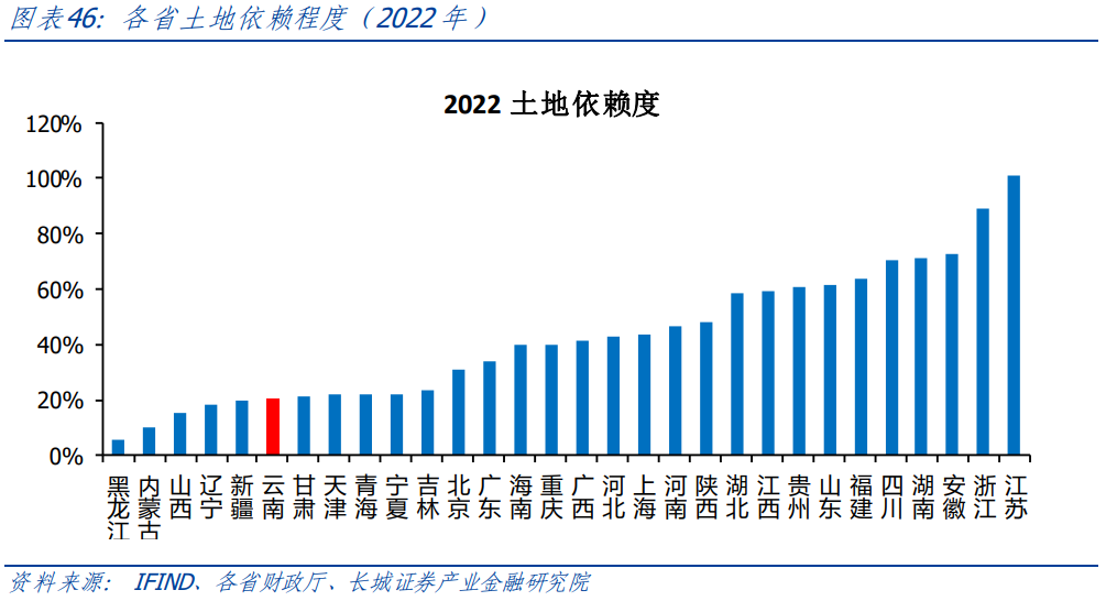 云南省財政對土地的依賴程度處于相對較低水平。我們以成交土地出讓金占地方公共財政收入的比例來近似衡量土地依賴程度,2022年云南省的土地依賴度居全國各省市末游水平,近10年以來云南省的土地依賴度經歷了劇烈的波動,且在2015年達到最低水平,為15.42%,2019年升至最高水平,為77.53%。2022年05月08日,云南省省委省政府聯(lián)合發(fā)布《關于調整完善土地出讓收入使用范圍優(yōu)先支持鄉(xiāng)村振興的實施意見》,穩(wěn)步提高土地出讓收入用于農業(yè)農村的比例,嚴禁以已有明確用途的土地出讓收入作為償債資金來源發(fā)行地方政府專項債券。并加強土地出讓收入用于農業(yè)農村資金的統(tǒng)籌使用。