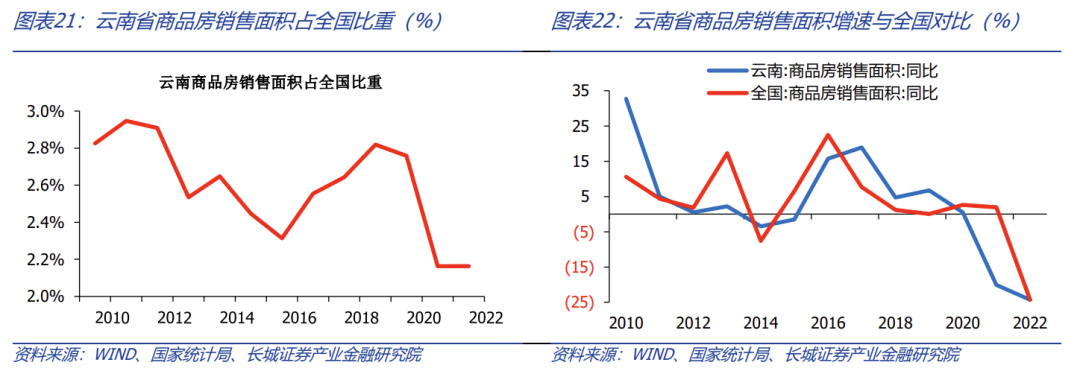 房地產消費方面,云南省商品房銷售價格低于全國,下降速度快于全國。根據國家統(tǒng)計局的數據顯示,2010-2022年云南省商品房銷售面積總體呈下降趨勢,期間出現兩次負增長:2014-2015年2021-2022。受疫情防控和房地產調控政策影響,2021云南省房地產銷售面積增速顯著下滑,同比下降20.1%。2022年進一步下降至-24.3%,與全國增速(-24.3%)一致。云南商品房銷售面積占全國的比例也下降至2.16%。2013-2021云南省商品房平均售價增長趨勢與全國相近,但顯著低于全國平均水平。商品房銷售額也與全國趨勢基本相近,2010-2020年云南省房地產銷售持續(xù)增長,但在2021年出現顯著的下降, 2022更進一步下降至1999.37億元,反映出房地產調控政策以來云南房地產市場的調整較為劇烈。