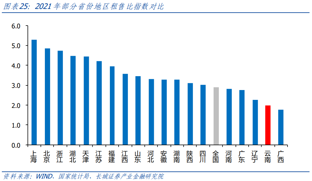 我們通過租售比指數(房價指數/房租指數)來刻畫租金與房價比值變化。2001-2021,云南租售比整體上呈上升趨勢,但增幅慢于全國增速。云南租售比在全國20省市排名中,較為靠后,且遠低于全國租售比,可以看出云南省房地產泡沫較低。