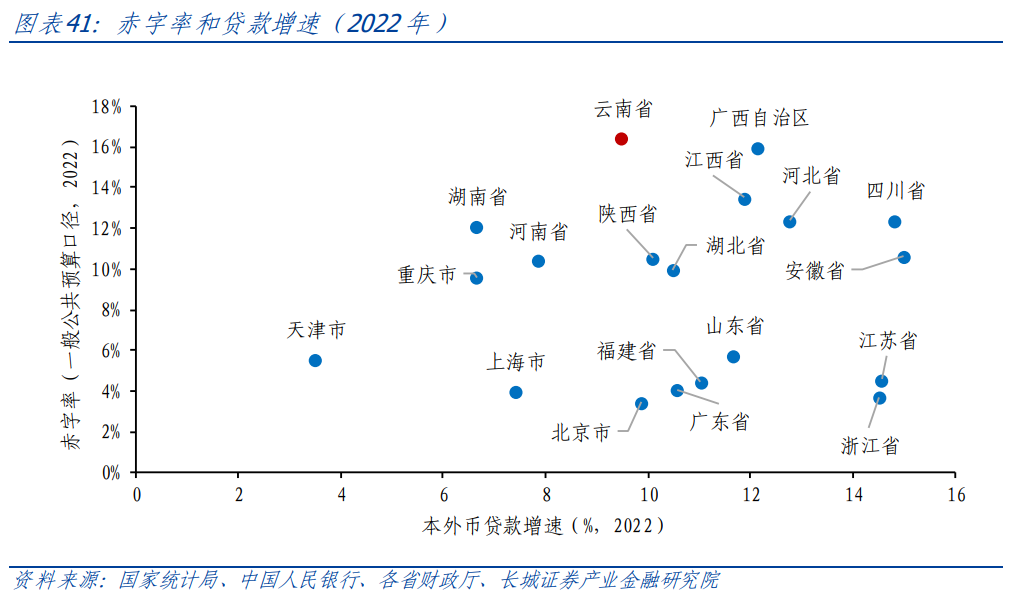 我們首先將云南省人民幣凈存款拆解為貸款和存款,云南省的貸款主力正在從住戶貸款過渡到企業(yè)貸款,但與全國相比,企業(yè)貸款需求也較弱。我們再將貸款拆解為企業(yè)和住戶兩個角度。企業(yè)端看,2016年-2017年,云南企業(yè)貸款增速高于全國,從2018年開始,云南企業(yè)貸款增速持續(xù)低于全國。住戶端看,近兩年受房地產收縮影響,云南居民貸款增速出現大幅下降。2022年4月,云南住戶貸款首次被企業(yè)貸款增速反超,貸款拉動項正在從住戶貸款轉換為企業(yè)貸款。
