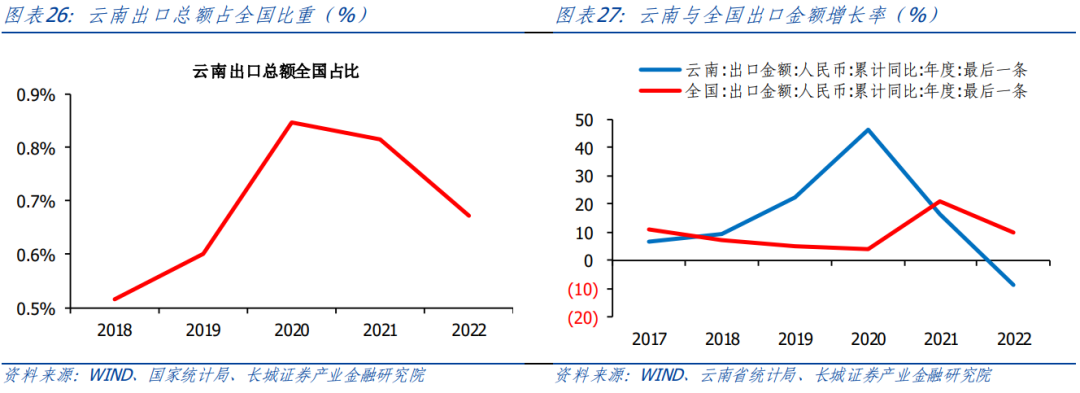 云南省出口潛力巨大。根據中國海關的數據統(tǒng)計,從進出口增速來看,2018-2022進出口總額保持增勢,其中2018年增速最快,同比達到24.68%。2022年進出口總值達3342.3億元人民幣,同比上升6.3%。究其原因,主要是由于,2022云南省出口總額出現逆增長,同比下降8.7%。從出口來看,2018-2020年云南省出口總額增速明顯高于全國,2020年時云南省出口增速為46.4%,遠高于2020全國增速4.01%,2021年之后就落到全國水平之下。云南省出口總額占全國比重持續(xù)較低,2022年云南省出口金額占全國比重為0.67%,在全國近20省市排行中,排名位居末游。