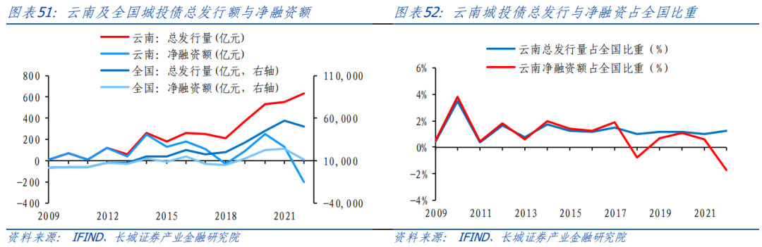 全國城投債總發(fā)行量在2009年完成三位數到四位數的躍升,達2725億元,從此發(fā)行規(guī)模增速不斷升高,2022年全國城投債總發(fā)行量達50458.81億元,2009-2022年云南總發(fā)行量年均增長率達29.31%。云南省城投債總發(fā)行量從2009年的8億元上漲到2022年的633.77億元,年均復合增長率(39.98%)高于全國。云南省城投債凈融資額變化趨勢與全國大體相近,2016-2018年出現下滑趨勢,此后開始逐步回升,2020年后再次降低。與總發(fā)行量不同的是凈融資額占全國比重出現較大波動,在2018年和2022年出現明顯下降。