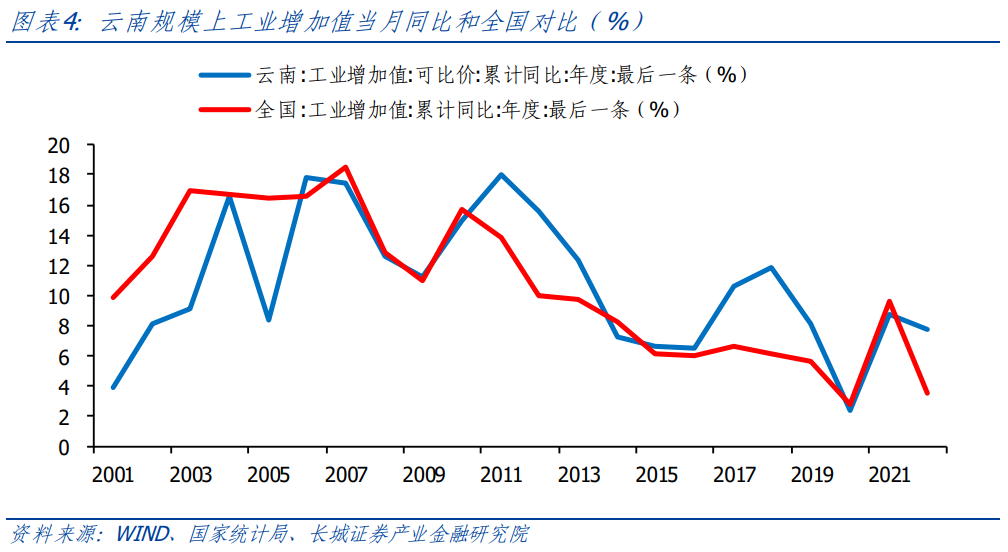 云南省第二產業(yè)波動較大,但增速快于全國。從趨勢上看,2011-2019年工業(yè)增加值整體高于全國,2020和2021與全國持平,2022又出現明顯的回升?!笆濉逼陂g,云南工業(yè)增加值從全國排名23躍居到第19,規(guī)模以上工業(yè)增加值年均增速達到7.8%,奮力直追。2022年工業(yè)增加值同比上漲7.7%,高于全國平均增加值(3.6%)的兩倍。