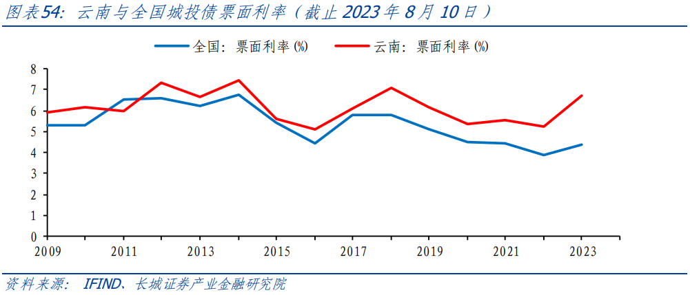 2018-2022年,云南和全國城投債票面利率呈逐年下降趨勢,2023年后兩者都有回升趨勢,云南有明顯上升且增速遠超全國。同花順數據顯示,2022年全國城投債票面利率為3.87%,較2018年下降192BP,發(fā)行成本下降。近十年,云南省的票面利率走勢基本和全國一致,但總體高于全國。2023年云南城投債票面利率為6.70%,高于全國234BP,較2022年上升148BP,融資成本明顯上升。