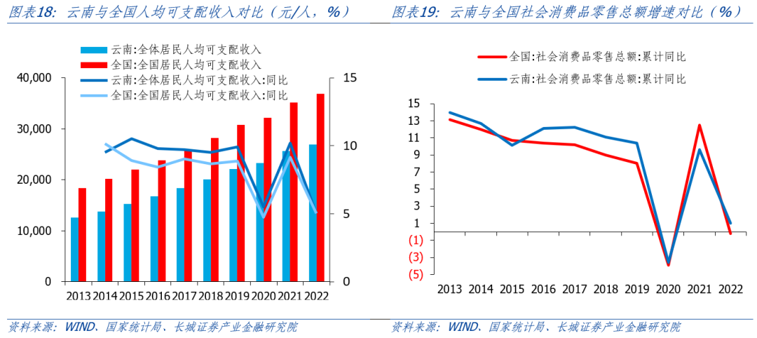 從消費方面來看,云南可支配收入穩(wěn)定增長并未帶動消費的快速增長。2013-2021年云南人均可支配收入相比全國水平有一定的差距,但增速基本略高全國水平。根據統(tǒng)計局的數據,2013-2022云南省社會消費品零售額增速和全國趨勢十分相近,且占全國比重逐年上升,由2013年的1.74%逐步升至2022年的2.46%;2022年云南省社會消費品零售總額達到10838.84億元,較上年同比下降0.2%,低于全國增速1%。