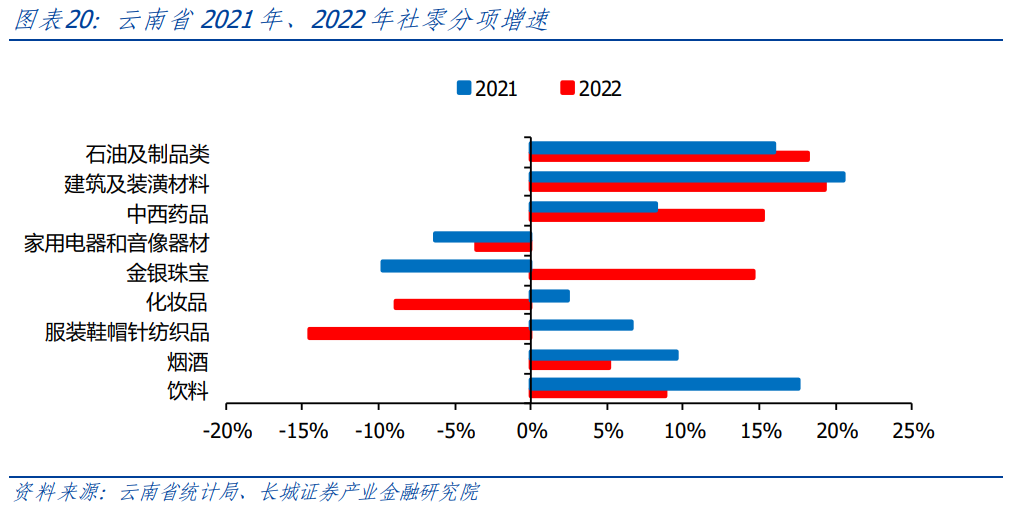 從消費結構的增速上來看,建筑及裝潢制品為主要消費項。根據統(tǒng)計局的數據來看, 2022年各類消費品中,除服裝鞋帽紡織品類和家用電器和音響器材類增速下降14.5%和3.6%,云南大部份商品都保持一定程度的增速,糧食及食品/金銀珠寶/中西藥類/石油及制品類/建筑及裝潢類等保持正增速,增速分別為5.5%/14.6%/15.3%/18.2%/19.3%。值得一提的是,2022年全年限額以上單位通過公共網絡實現的商品零售額121.22億元,比上年增長28.2%,電商發(fā)展迅速。